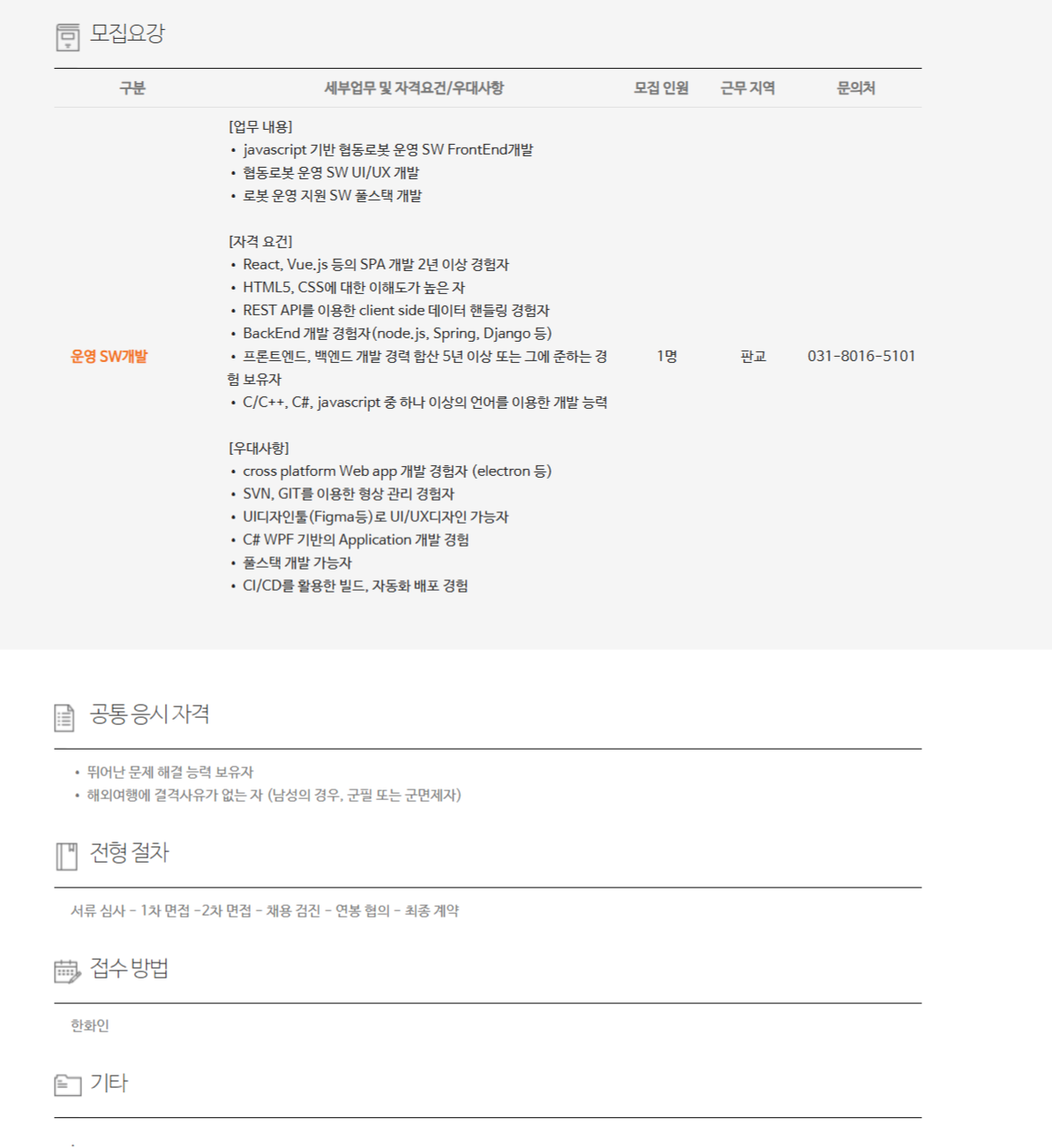 ¿î¿µ SW°³¹ß [¾÷¹« ³»¿ë] • javascript ±â¹Ý Çùµ¿·Îº¿ ¿î¿µ SW FrontEnd°³¹ß • Çùµ¿·Îº¿ ¿î¿µ SW UI/UX °³¹ß • ·Îº¿ ¿î¿µ Áö¿ø SW Ç®½ºÅà °³¹ß [ÀÚ°Ý ¿ä°Ç] • React, Vue.js µîÀÇ SPA °³¹ß 2³â ÀÌ»ó °æÇèÀÚ • HTML5, CSS¿¡ ´ëÇÑ ÀÌÇØµµ°¡ ³ôÀº ÀÚ • REST API¸¦ ÀÌ¿ëÇÑ client side µ¥ÀÌÅÍ Çڵ鸵 °æÇèÀÚ • BackEnd °³¹ß °æÇèÀÚ(node.js, Spring, Django µî) • ÇÁ·ÐÆ®¿£µå, ¹é¿£µå °³¹ß °æ·Â ÇÕ»ê 5³â ÀÌ»ó ¶Ç´Â ±×¿¡ ÁØÇÏ´Â °æÇè º¸À¯ÀÚ • C/C++, C#, javascript Áß Çϳª ÀÌ»óÀÇ ¾ð¾î¸¦ ÀÌ¿ëÇÑ °³¹ß ´É·Â [¿ì´ë»çÇ×] • cross platform Web app °³¹ß °æÇèÀÚ (electron µî) • SVN, GIT¸¦ ÀÌ¿ëÇÑ Çü»ó °ü¸® °æÇèÀÚ • UIµðÀÚÀÎÅø(Figmaµî)·Î UI/UXµðÀÚÀÎ °¡´ÉÀÚ • C# WPF ±â¹ÝÀÇ Application °³¹ß °æÇè • Ç®½ºÅà °³¹ß °¡´ÉÀÚ • CI/CD¸¦ Ȱ¿ëÇÑ ºôµå, ÀÚµ¿È­ ¹èÆ÷ °æÇè 1¸í ÆÇ±³ ***-****-****