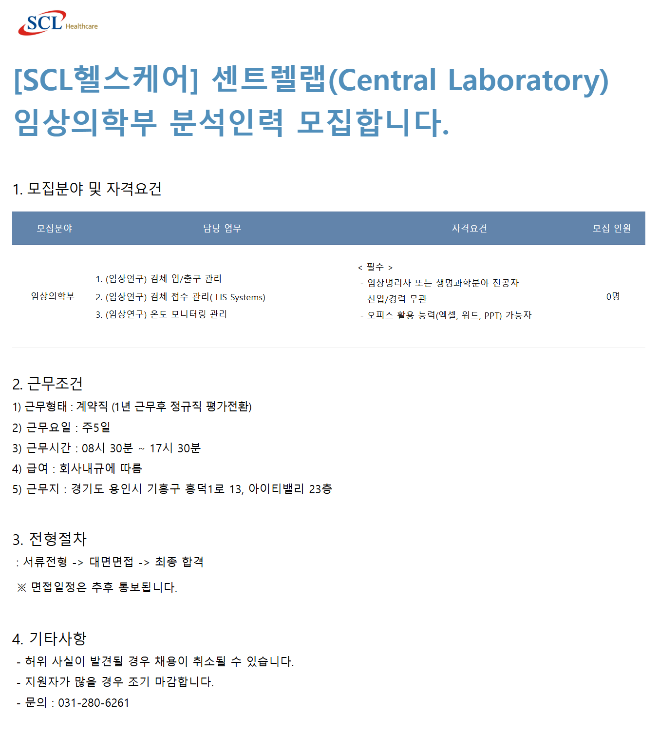 [SCLÇコÄɾî] ¼¾Æ®·¼·¦(Central Laboratory) ÀÓ»óÀÇÇкΠºÐ¼®Àη ¸ðÁýÇÕ´Ï´Ù.