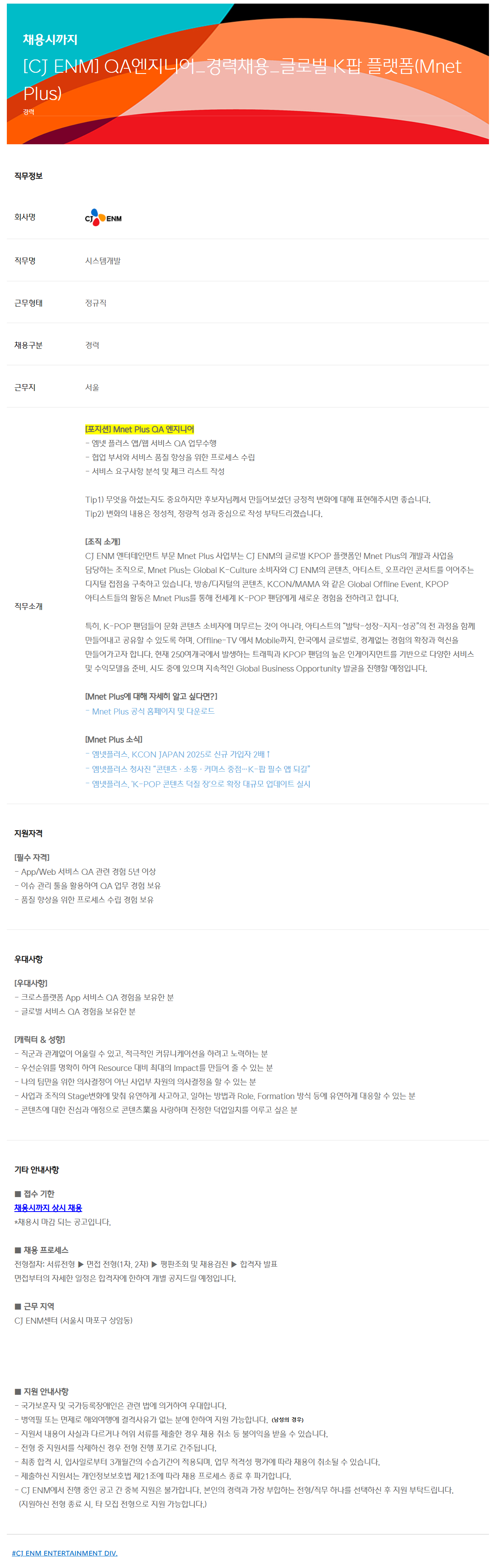 Á÷¹«¼Ò°³ [Æ÷Áö¼Ç] Mnet Plus QA ¿£Áö´Ï¾î