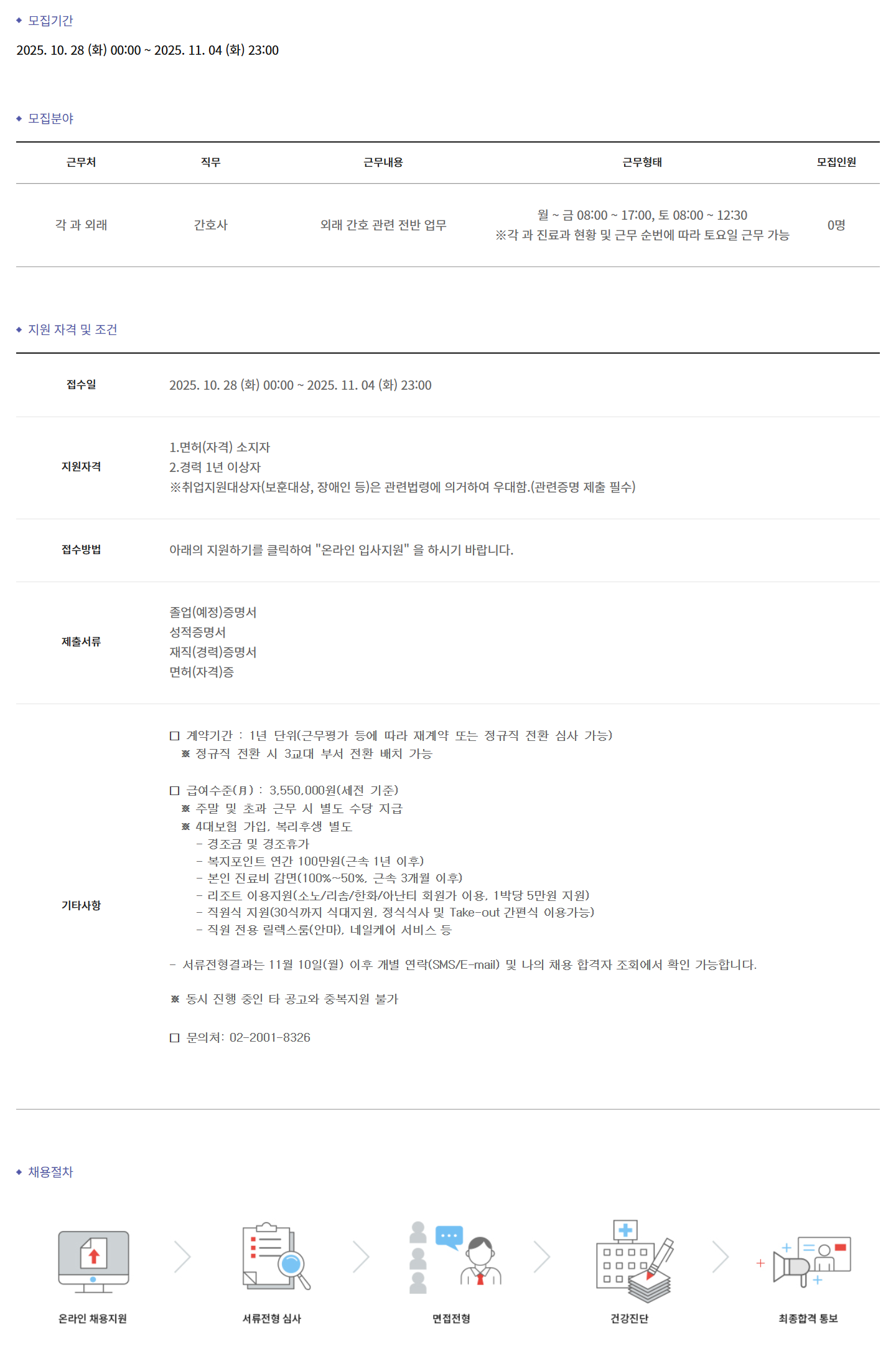 ±Ù¹«Ã³ Á÷¹« ±Ù¹«³»¿ë ±Ù¹«ÇüÅ ¸ðÁýÀοø °¢ °ú ¿Ü·¡ °£È£»ç ¿Ü·¡ °£È£ °ü·Ã Àü¹Ý ¾÷¹« ¿ù ~ ±Ý 08:00 ~ 17:00, Åä 08:00 ~ 12:30 ¡Ø°¢ °ú Áø·á°ú ÇöȲ ¹× ±Ù¹« ¼ø¹ø¿¡ µû¶ó Åä¿äÀÏ ±Ù¹« °¡´É 0¸í