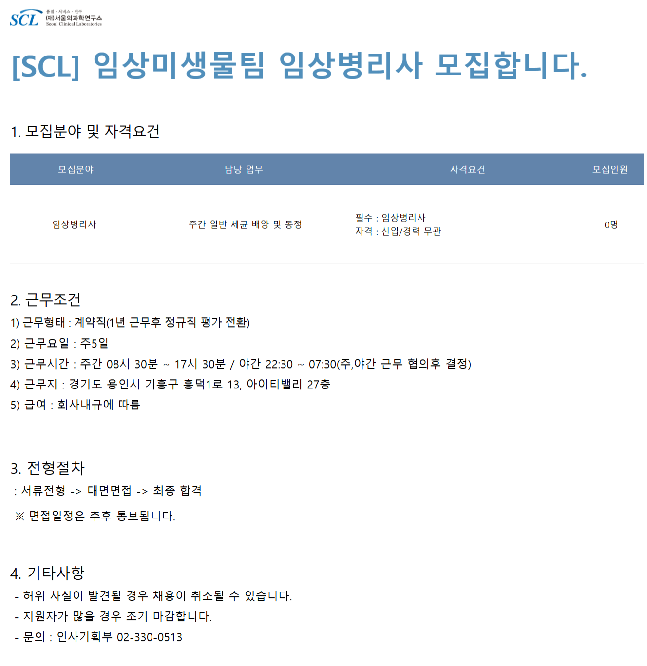 [SCL] ÀÓ»ó¹Ì»ý¹°ÆÀ ÀÓ»óº´¸®»ç ¸ðÁýÇÕ´Ï´Ù.