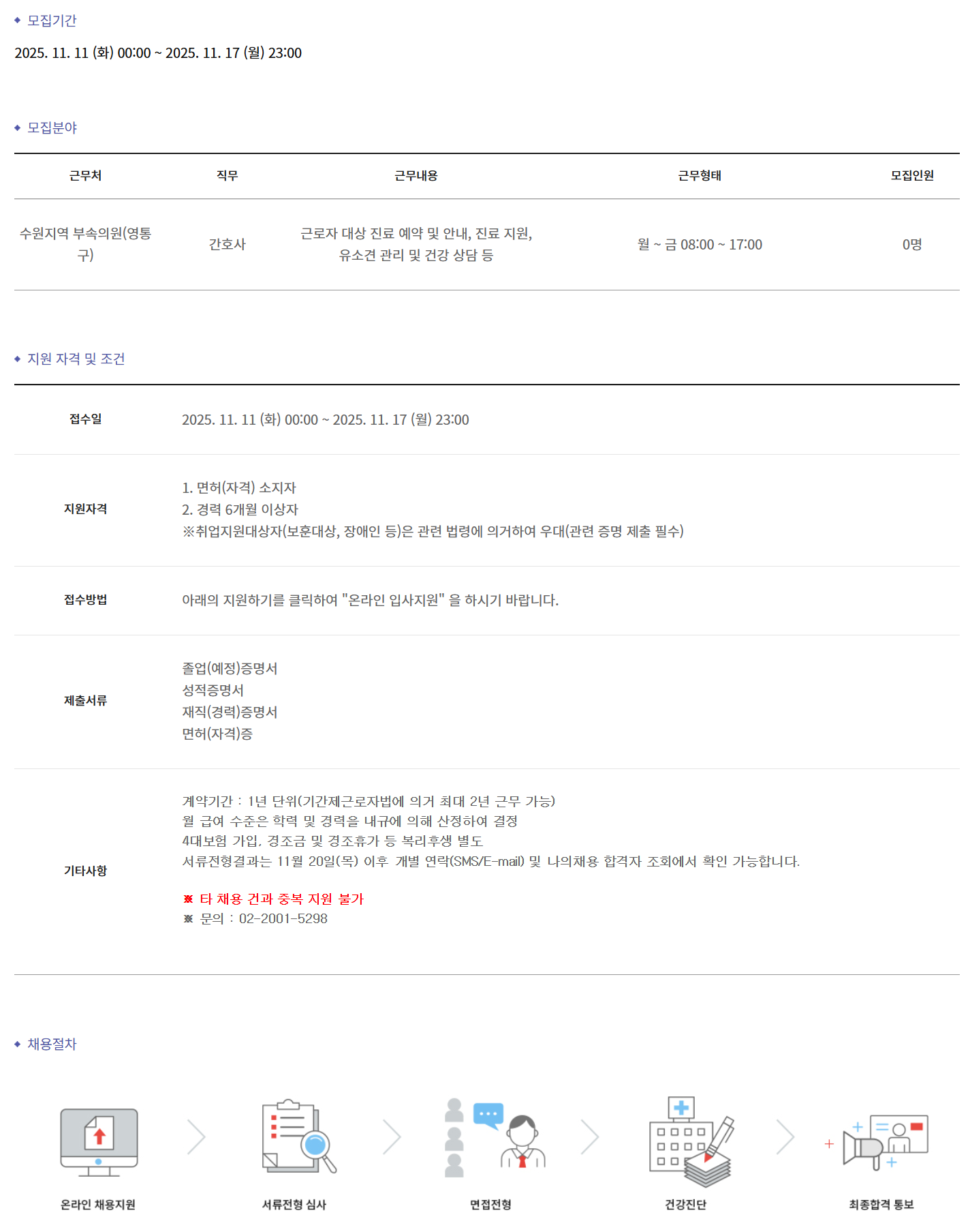 ±Ù¹«Ã³ Á÷¹« ±Ù¹«³»¿ë ±Ù¹«ÇüÅ ¸ðÁýÀοø ¼ö¿øÁö¿ª ºÎ¼ÓÀÇ¿ø(¿µÅ뱸) °£È£»ç ±Ù·ÎÀÚ ´ë»ó Áø·á ¿¹¾à ¹× ¾È³», Áø·á Áö¿ø, À¯¼Ò°ß °ü¸® ¹× °Ç° »ó´ã µî ¿ù ~ ±Ý 08:00 ~ 17:00 0¸í