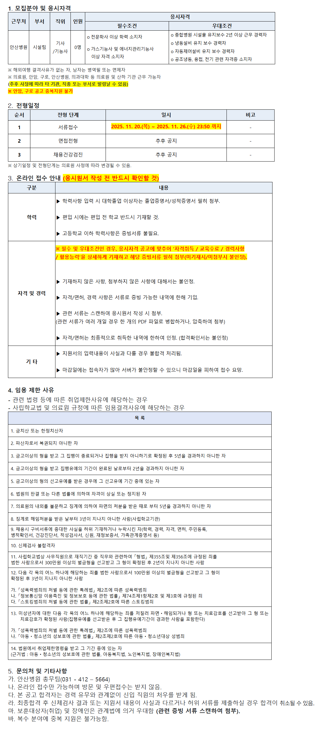 [¾È»êº´¿ø Á¤±ÔÁ÷ 25-27] ½Ã¼³ÆÀ ±â°è½Ç ½Å±Ô±³Á÷¿ø ¸ðÁý 1. ¸ðÁýºÐ¾ß ¹× ÀÀ½ÃÀÚ°Ý ±Ù¹«Ã³ ºÎ¼­ Á÷À§ Àοø ÀÀ½ÃÀÚ°Ý ÇʼöÁ¶°Ç ¿ì´ëÁ¶°Ç ¾È»êº´¿ø ½Ã¼³ÆÀ ±â»ç /±â´É»ç 0¸í o Àü¹®Çлç ÀÌ»ó Çз ¼ÒÁöÀÚ o °¡½º±â´É»ç ¹× ¿¡³ÊÁö°ü¸®±â´É»ç ÀÌ»ó ÀÚ°Ý ¼ÒÁöÀÚ o Á¾ÇÕº´¿ø ½Ã¼³¹° À¯Áöº¸¼ö 2³â ÀÌ»ó ±Ù¹« °æ·ÂÀÚ o ³Ãµ¿¼³ºñ À¯Áö º¸¼ö °æ·ÂÀÚ o ÀÚµ¿Á¦¾î¼³ºñ À¯Áö º¸¼ö °æ·ÂÀÚ o °øÁ¶³Ãµ¿, ¿ëÁ¢, Àü±â °ü·Ã ÀÚ°ÝÁõ ¼ÒÁöÀÚ ¡Ø ÇØ¿Ü¿©Çà °á°Ý»çÀ¯°¡ ¾ø´Â ÀÚ, ³²ÀÚ´Â º´¿ªÇÊ ¶Ç´Â ¸éÁ¦ÀÚ ¡Ø ÀÇ·á¿ø, ¾È¾Ï, ±¸·Î, ¾È»êº´¿ø, Àǰú´ëÇÐ µî ÀÇ·á¿ø ¹× »êÇÏ ±â°ü ±Ù¹« °¡´ÉÀÚ (ÃßÈÄ »çÁ¤¿¡ µû¶ó Ÿ ±â°ü, Á÷Á¾ ¶Ç´Â ºÎ¼­·Î ¹ß·É³¯ ¼ö ÀÖÀ½) ¡Ø ¾È¾Ï, ±¸·Î °ø°í Áߺ¹Áö¿ø ºÒ°¡ 2. ÀüÇüÀÏÁ¤ ¼ø¼­ ÀüÇü ´Ü°è ÀϽà ºñ°í 1 ¼­·ùÁ¢¼ö 2025. 11. 20.(¸ñ) ~ 2025. 11. 26.(¼ö) 23:50 ±îÁö - 2 ¸éÁ¢ÀüÇü ÃßÈÄ °øÁö - 3 ä¿ë°Ç°­°ËÁø ÃßÈÄ °øÁö - ¡Ø »ó±âÀÏÁ¤ ¹× ÀüÇü´Ü°è´Â ÀÇ·á¿ø »çÁ¤¿¡ µû¶ó º¯°æµÉ ¼ö ÀÖÀ½. 3. ¿Â¶óÀÎ Á¢¼ö ¾È³» (ÀÀ½Ã¿ø¼­ ÀÛ¼º Àü ¹Ýµå½Ã È®ÀÎÇÒ °Í) ±¸ºÐ ³»¿ë Çз ¢º Çз»çÇ× ÀÔ·Â ½Ã ´ëÇÐÁ¹¾÷ ÀÌ»óÀÚ´Â Á¹¾÷Áõ¸í¼­/¼ºÀûÁõ¸í¼­ ÇÊÈ÷ ÷ºÎ. ¢º ÆíÀÔ ½Ã¿¡´Â ÆíÀÔ Àü Çб³ ¹Ýµå½Ã ±âÀçÇÒ °Í. ¢º °íµîÇб³ ÀÌÇÏ Çз»çÇ×Àº Áõºù¼­·ù ºÒÇÊ¿ä. ÀÚ°Ý ¹× °æ·Â ¡Ø Çʼö ¹× ¿ì´ëÁ¶°ÇÀÎ °æ¿ì, ÀÀ½ÃÀÚ°Ý °ø°í¿¡ ¸ÂÃß¾î ¡®ÀÚ°ÝÃëµæ / ±³À°¼ö·á / °æ·Â»çÇ× / Ȱ¿ë´É·Â¡¯À» »ó¼¼ÇÏ°Ô ±âÀçÇϰí ÇØ´ç Áõºù¼­·ù ÇÊÈ÷ ÷ºÎ(¹Ì±âÀç½Ã/¹Ì÷ºÎ½Ã ºÒÀÎÁ¤). ¢º ±âÀçÇÏÁö ¾ÊÀº »çÇ×, ÷ºÎÇÏÁö ¾ÊÀº »çÇ׿¡ ´ëÇØ¼­´Â ºÒÀÎÁ¤. ¢º ÀÚ°Ý/¸éÇã, °æ·Â »çÇ×Àº ¼­·ù·Î Áõºù °¡´ÉÇÑ ³»¿ª¿¡ ÇÑÇØ ±âÀÔ. ¢º °ü·Ã ¼­·ù´Â ½ºÄµÇÏ¿© ÀÀ½Ã¿ø¼­ ÀÛ¼º ½Ã ÷ºÎ. (°ü·Ã ¼­·ù°¡ ¿©·¯ °³ÀÏ °æ¿ì ÇÑ °³ÀÇ PDF ÆÄÀÏ·Î º´ÇÕÇϰųª, ¾ÐÃàÇÏ¿© ÷ºÎ) ¢º ÀÚ°Ý/¸éÇã´Â ÃÖÁ¾ÀûÀ¸·Î ÃëµæÇÑ ³»¿ª¿¡ ÇÑÇÏ¿© ÀÎÁ¤. (ÇÕ°ÝÈ®Àμ­´Â ºÒÀÎÁ¤) ±â Ÿ ¢º Áö¿ø¼­ÀÇ ÀԷ³»¿ëÀÌ »ç½Ç°ú ´Ù¸¦ °æ¿ì ºÒÇÕ°Ý Ã³¸®µÊ. ¢º ¸¶°¨ÀÏ¿¡´Â Á¢¼ÓÀÚ°¡ ¸¹¾Æ ¼­¹ö°¡ ºÒ¾ÈÁ¤ÇÒ ¼ö ÀÖÀ¸´Ï ¸¶°¨ÀÏÀ» ÇÇÇÏ¿© Á¢¼ö ¿ä¸Á. 4. ÀÓ¿ë Á¦ÇÑ »çÀ¯ - °ü·Ã ¹ý·É µî¿¡ µû¸¥ Ãë¾÷Á¦ÇÑ»çÀ¯¿¡ ÇØ´çÇÏ´Â °æ¿ì - »ç¸³Çб³¹ý ¹× ÀÇ·á¿ø ±ÔÁ¤¿¡ µû¸¥ ÀÓ¿ë°á°Ý»çÀ¯¿¡ ÇØ´çÇÏ´Â °æ¿ì ¸ñ ·Ï 1. ±ÝÄ¡»ê ¶Ç´Â ÇÑÁ¤Ä¡»êÀÚ 2. ÆÄ»êÀڷμ­ º¹±ÇµÇÁö ¾Æ´ÏÇÑ ÀÚ 3. ±Ý°íÀÌ»óÀÇ ÇüÀ» ¹Þ°í ±× ÁýÇàÀÌ Á¾·áµÇ°Å³ª ÁýÇàÀ» ¹ÞÁö ¾Æ´ÏÇϱâ·Î È®Á¤µÈ ÈÄ 5³âÀ» °æ°úÇÏÁö ¾Æ´ÏÇÑ ÀÚ 4. ±Ý°íÀÌ»óÀÇ ÇüÀ» ¹Þ°í ÁýÇàÀ¯¿¹ÀÇ ±â°£ÀÌ ¿Ï·áµÈ ³¯·ÎºÎÅÍ 2³âÀ» °æ°úÇÏÁö ¾Æ´ÏÇÑ ÀÚ 5. ±Ý°íÀÌ»óÀÇ ÇüÀÇ ¼±°íÀ¯¿¹¸¦ ¹ÞÀº °æ¿ì¿¡ ±× ¼±°íÀ¯¿¹ ±â°£ Áß¿¡ ÀÖ´Â ÀÚ 6. ¹ý¿øÀÇ ÆÇ°á ¶Ç´Â ´Ù¸¥ ¹ý·ü¿¡ ÀÇÇÏ¿© ÀÚ°ÝÀÌ »ó½Ç ¶Ç´Â Á¤ÁöµÈ ÀÚ 7. ÀÇ·á¿øÀÇ ³»¿Ü¸¦ ºÒ¹®Çϰí ¡°è¿¡ ÀÇÇÏ¿© ÆÄ¸éÀÇ Ã³ºÐÀ» ¹ÞÀº ¶§·Î ºÎÅÍ 5³âÀ» °æ°úÇÏÁö ¾Æ´ÏÇÑ ÀÚ 8. ¡°è·Î ÇØÀÓóºÐÀ» ¹ÞÀº ³¯ºÎÅÍ 3³âÀÌ Áö³ªÁö ¾Æ´ÏÇÑ »ç¶÷(»ç¸³Çб³±â°ü) 9. ä¿ë½Ã ±¸ºñ¼­·ù¿¡ Áß´ëÇÑ »ç½ÇÀ» ÇãÀ§ ±âÀçÇϰųª ´©¶ô½ÃŲ ÀÚ(ÇзÂ, °æ·Â, ÀÚ°Ý, ¸éÇã, Áֹεî·Ï, º´ÀûÈ®Àμ­, °Ç°­Áø´Ü¼­, Àû¼º°Ë»ç¼­, ½Å¿ø, ÀçÁ¤º¸Áõ¼­, °¡Á·°ü°èÁõ¸í¼­ µî) 10. ½Åü°Ë»ç ºÒÇÕ°ÝÀÚ 11. »ç¸³Çб³¹ý»ó »ç¹«Á÷¿øÀ¸·Î ÀçÁ÷±â°£ Áß Á÷¹«¿Í °ü·ÃÇÏ¿© ¡¸Çü¹ý¡¹ Á¦355Á¶¹× Á¦356Á¶¿¡ ±ÔÁ¤µÈ Á˸¦ ¹üÇÑ »ç¶÷À¸·Î¼­ 300¸¸¿ø ÀÌ»óÀÇ ¹ú±ÝÇüÀ» ¼±°í¹Þ°í ±× ÇüÀÌ È®Á¤µÈ ÈÄ 2³âÀÌ Áö³ªÁö ¾Æ´ÏÇÑ »ç¶÷ 12. ´ÙÀ½ °¢ ¸ñÀÇ ¾î´À Çϳª¿¡ ÇØ´çÇÏ´Â Á˸¦ ¹üÇÑ »ç¶÷À¸·Î¼­ 100¸¸¿ø ÀÌ»óÀÇ ¹ú±ÝÇüÀ» ¼±°í¹Þ°í ±× ÇüÀÌ È®Á¤µÈ ÈÄ 3³âÀÌ Áö³ªÁö ¾Æ´ÏÇÑ »ç¶÷ °¡. ¡¸¼ºÆø·Â¹üÁËÀÇ Ã³¹ú µî¿¡ °üÇÑ Æ¯·Ê¹ý¡¹ Á¦2Á¶¿¡ µû¸¥ ¼ºÆø·Â¹üÁË ³ª. ¡¸Á¤º¸Åë½Å¸Á ÀÌ¿ëÃËÁø ¹× Á¤º¸º¸È£ µî¿¡ °üÇÑ ¹ý·ü¡¹ Á¦74Á¶Á¦1Ç×Á¦2È£ ¹× Á¦3È£¿¡ ±ÔÁ¤µÈ ÁË ´Ù. ¡¸½ºÅäÅ·¹üÁËÀÇ Ã³¹ú µî¿¡ °üÇÑ ¹ý·ü¡¹ Á¦2Á¶Á¦2È£¿¡ µû¸¥ ½ºÅäÅ·¹üÁË 13. ¹Ì¼º³âÀÚ¿¡ ´ëÇÑ ´ÙÀ½ °¢ ¸ñÀÇ ¾î´À Çϳª¿¡ ÇØ´çÇÏ´Â Á˸¦ ÀúÁú·¯ ÆÄ¸é¤ýÇØÀӵǰųª Çü ¶Ç´Â Ä¡·á°¨È£¸¦ ¼±°í¹Þ¾Æ ±× Çü ¶Ç´Â Ä¡·á°¨È£°¡ È®Á¤µÈ »ç¶÷(ÁýÇàÀ¯¿¹¸¦ ¼±°í¹ÞÀº ÈÄ ±× ÁýÇàÀ¯¿¹±â°£ÀÌ °æ°úÇÑ »ç¶÷À» Æ÷ÇÔÇÑ´Ù) °¡. ¡¸¼ºÆø·Â¹üÁËÀÇ Ã³¹ú µî¿¡ °üÇÑ Æ¯·Ê¹ý¡¹ Á¦2Á¶¿¡ µû¸¥ ¼ºÆø·
