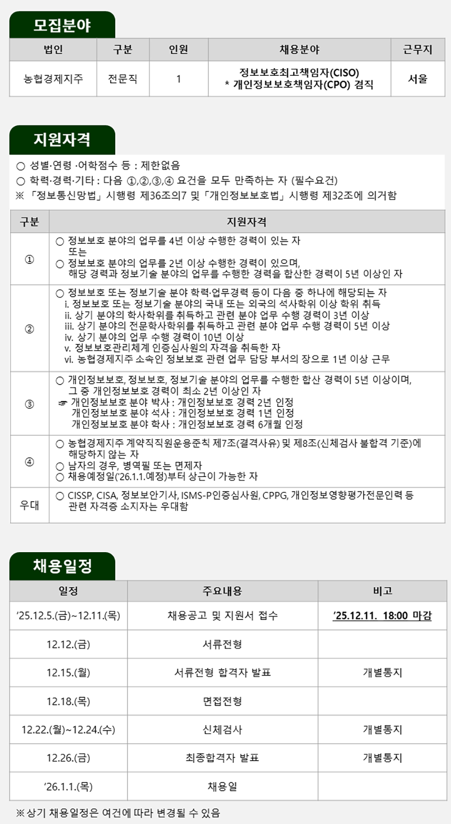'25.12.5.(±Ý)~12.11.(¸ñ) ä¿ë°ø°í ¹× Áö¿ø¼ Á¢¼ö '25.12.11. 18:00 ¸¶°¨