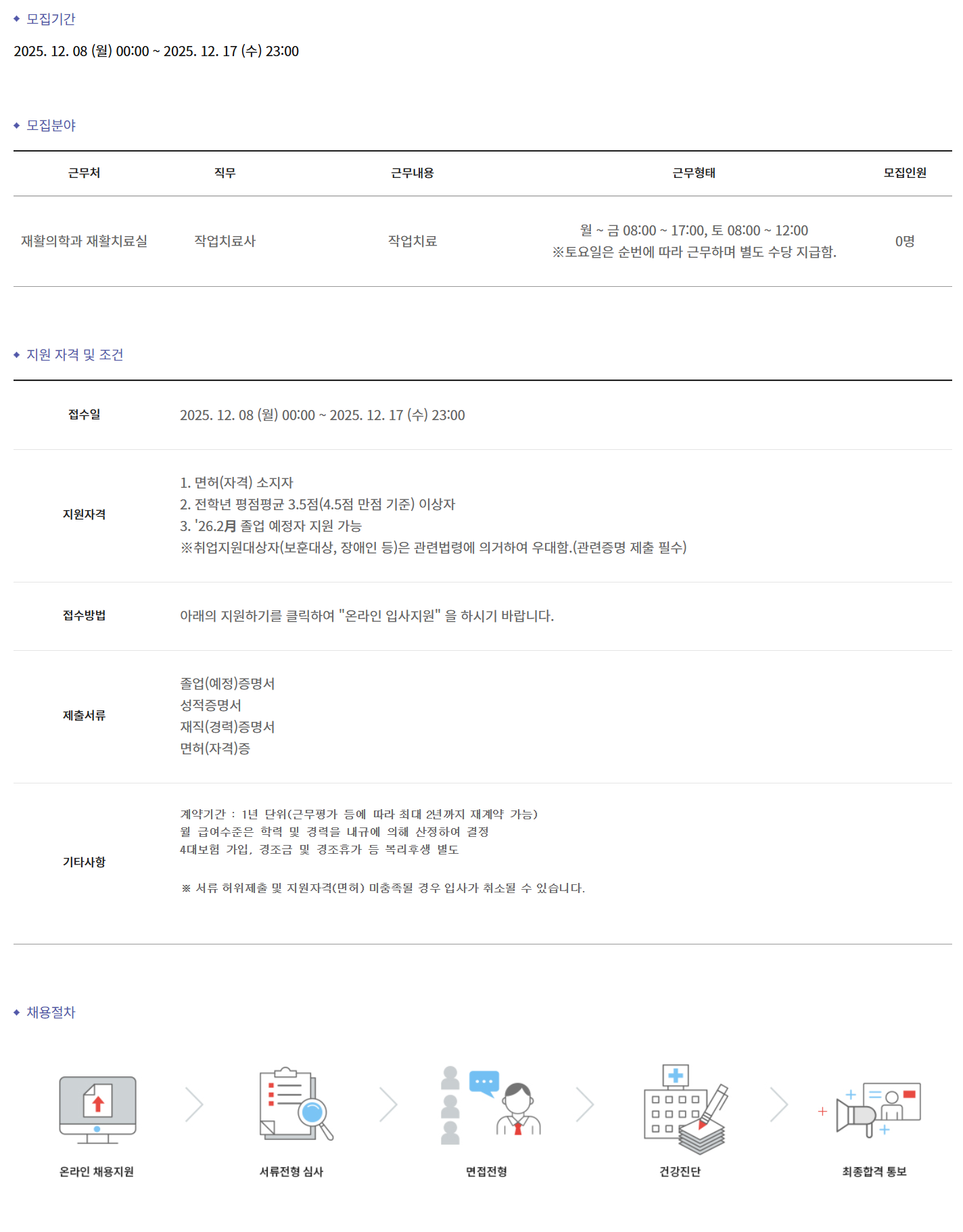 ±Ù¹«Ã³ Á÷¹« ±Ù¹«³»¿ë ±Ù¹«ÇüÅ ¸ðÁýÀοø ÀçȰÀÇÇаú ÀçȰġ·á½Ç ÀÛ¾÷Ä¡·á»ç ÀÛ¾÷Ä¡·á ¿ù ~ ±Ý 08:00 ~ 17:00, Åä 08:00 ~ 12:00 ¡ØÅä¿äÀÏÀº ¼ø¹ø¿¡ µû¶ó ±Ù¹«ÇÏ¸ç º°µµ ¼ö´ç Áö±ÞÇÔ. 0¸í