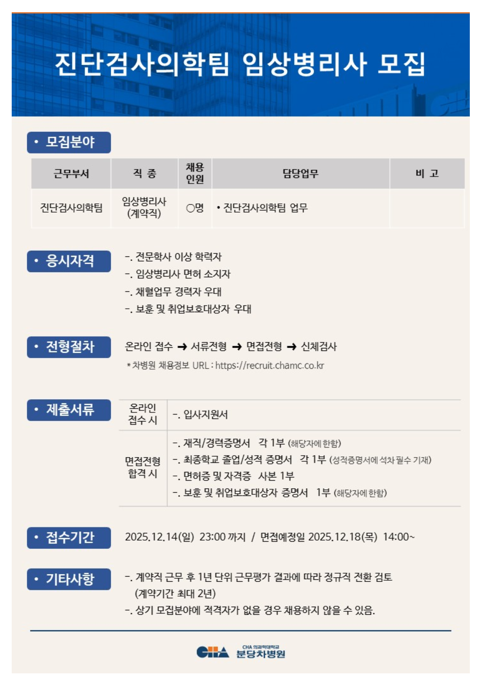 [ºÐ´çÂ÷º´¿ø] Áø´Ü°Ë»çÀÇÇÐÆÀ ÀÓ»óº´¸®»ç ¸ðÁý