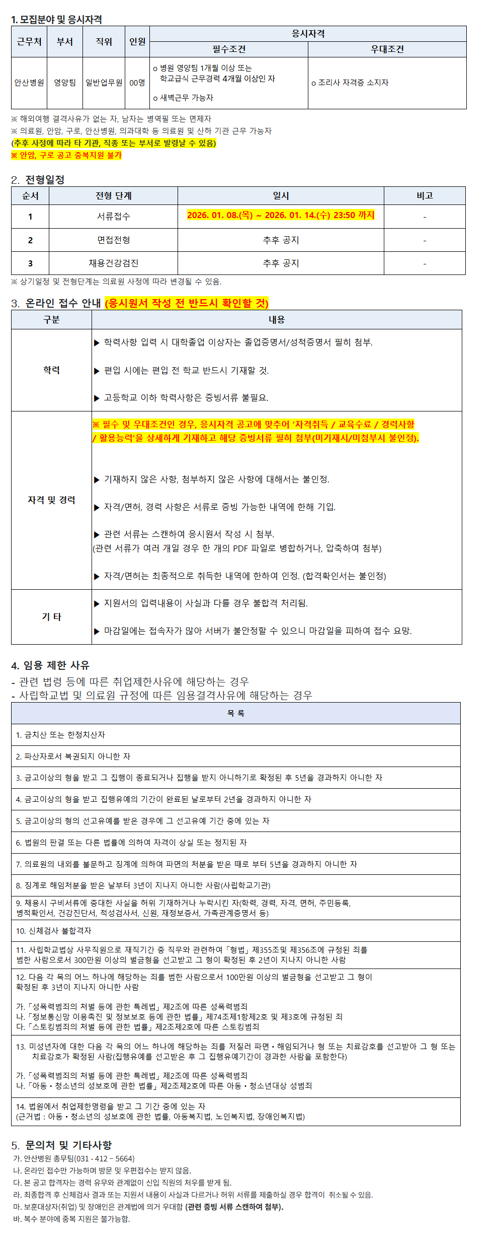 [¾È»êº´¿ø Á¤±ÔÁ÷ 25-34] ¿µ¾çÆÀ ÀϹݾ÷¹«¿ø ½Å±Ô±³Á÷¿ø ¸ðÁý 1. ¸ðÁýºÐ¾ß ¹× ÀÀ½ÃÀÚ°Ý ±Ù¹«Ã³ ºÎ¼­ Á÷À§ Àοø ÀÀ½ÃÀÚ°Ý ÇʼöÁ¶°Ç ¿ì´ëÁ¶°Ç ¾È»êº´¿ø ¿µ¾çÆÀ ÀϹݾ÷¹«¿ø 00¸í o º´¿ø ¿µ¾çÆÀ 1°³¿ù ÀÌ»ó ¶Ç´Â Çб³±Þ½Ä ±Ù¹«°æ·Â 4°³¿ù ÀÌ»óÀÎ ÀÚ o »õº®±Ù¹« °¡´ÉÀÚ o Á¶¸®»ç ÀÚ°ÝÁõ ¼ÒÁöÀÚ ¡Ø ÇØ¿Ü¿©Çà °á°Ý»çÀ¯°¡ ¾ø´Â ÀÚ, ³²ÀÚ´Â º´¿ªÇÊ ¶Ç´Â ¸éÁ¦ÀÚ ¡Ø ÀÇ·á¿ø, ¾È¾Ï, ±¸·Î, ¾È»êº´¿ø, Àǰú´ëÇÐ µî ÀÇ·á¿ø ¹× »êÇÏ ±â°ü ±Ù¹« °¡´ÉÀÚ (ÃßÈÄ »çÁ¤¿¡ µû¶ó Ÿ ±â°ü, Á÷Á¾ ¶Ç´Â ºÎ¼­·Î ¹ß·É³¯ ¼ö ÀÖÀ½) ¡Ø ¾È¾Ï, ±¸·Î °ø°í Áߺ¹Áö¿ø ºÒ°¡ 2. ÀüÇüÀÏÁ¤ ¼ø¼­ ÀüÇü ´Ü°è ÀϽà ºñ°í 1 ¼­·ùÁ¢¼ö 2026. 01. 08.(¸ñ) ~ 2026. 01. 14.(¼ö) 23:50 ±îÁö - 2 ¸éÁ¢ÀüÇü ÃßÈÄ °øÁö - 3 ä¿ë°Ç°­°ËÁø ÃßÈÄ °øÁö - ¡Ø »ó±âÀÏÁ¤ ¹× ÀüÇü´Ü°è´Â ÀÇ·á¿ø »çÁ¤¿¡ µû¶ó º¯°æµÉ ¼ö ÀÖÀ½. 3. ¿Â¶óÀÎ Á¢¼ö ¾È³» (ÀÀ½Ã¿ø¼­ ÀÛ¼º Àü ¹Ýµå½Ã È®ÀÎÇÒ °Í) ±¸ºÐ ³»¿ë Çз ¢º Çз»çÇ× ÀÔ·Â ½Ã ´ëÇÐÁ¹¾÷ ÀÌ»óÀÚ´Â Á¹¾÷Áõ¸í¼­/¼ºÀûÁõ¸í¼­ ÇÊÈ÷ ÷ºÎ. ¢º ÆíÀÔ ½Ã¿¡´Â ÆíÀÔ Àü Çб³ ¹Ýµå½Ã ±âÀçÇÒ °Í. ¢º °íµîÇб³ ÀÌÇÏ Çз»çÇ×Àº Áõºù¼­·ù ºÒÇÊ¿ä. ÀÚ°Ý ¹× °æ·Â ¡Ø Çʼö ¹× ¿ì´ëÁ¶°ÇÀÎ °æ¿ì, ÀÀ½ÃÀÚ°Ý °ø°í¿¡ ¸ÂÃß¾î ¡®ÀÚ°ÝÃëµæ / ±³À°¼ö·á / °æ·Â»çÇ× / Ȱ¿ë´É·Â¡¯À» »ó¼¼ÇÏ°Ô ±âÀçÇϰí ÇØ´ç Áõºù¼­·ù ÇÊÈ÷ ÷ºÎ(¹Ì±âÀç½Ã/¹Ì÷ºÎ½Ã ºÒÀÎÁ¤). ¢º ±âÀçÇÏÁö ¾ÊÀº »çÇ×, ÷ºÎÇÏÁö ¾ÊÀº »çÇ׿¡ ´ëÇØ¼­´Â ºÒÀÎÁ¤. ¢º ÀÚ°Ý/¸éÇã, °æ·Â »çÇ×Àº ¼­·ù·Î Áõºù °¡´ÉÇÑ ³»¿ª¿¡ ÇÑÇØ ±âÀÔ. ¢º °ü·Ã ¼­·ù´Â ½ºÄµÇÏ¿© ÀÀ½Ã¿ø¼­ ÀÛ¼º ½Ã ÷ºÎ. (°ü·Ã ¼­·ù°¡ ¿©·¯ °³ÀÏ °æ¿ì ÇÑ °³ÀÇ PDF ÆÄÀÏ·Î º´ÇÕÇϰųª, ¾ÐÃàÇÏ¿© ÷ºÎ) ¢º ÀÚ°Ý/¸éÇã´Â ÃÖÁ¾ÀûÀ¸·Î ÃëµæÇÑ ³»¿ª¿¡ ÇÑÇÏ¿© ÀÎÁ¤. (ÇÕ°ÝÈ®Àμ­´Â ºÒÀÎÁ¤) ±â Ÿ ¢º Áö¿ø¼­ÀÇ ÀԷ³»¿ëÀÌ »ç½Ç°ú ´Ù¸¦ °æ¿ì ºÒÇÕ°Ý Ã³¸®µÊ. ¢º ¸¶°¨ÀÏ¿¡´Â Á¢¼ÓÀÚ°¡ ¸¹¾Æ ¼­¹ö°¡ ºÒ¾ÈÁ¤ÇÒ ¼ö ÀÖÀ¸´Ï ¸¶°¨ÀÏÀ» ÇÇÇÏ¿© Á¢¼ö ¿ä¸Á. 4. ÀÓ¿ë Á¦ÇÑ »çÀ¯ - °ü·Ã ¹ý·É µî¿¡ µû¸¥ Ãë¾÷Á¦ÇÑ»çÀ¯¿¡ ÇØ´çÇÏ´Â °æ¿ì - »ç¸³Çб³¹ý ¹× ÀÇ·á¿ø ±ÔÁ¤¿¡ µû¸¥ ÀÓ¿ë°á°Ý»çÀ¯¿¡ ÇØ´çÇÏ´Â °æ¿ì ¸ñ ·Ï 1. ±ÝÄ¡»ê ¶Ç´Â ÇÑÁ¤Ä¡»êÀÚ 2. ÆÄ»êÀڷμ­ º¹±ÇµÇÁö ¾Æ´ÏÇÑ ÀÚ 3. ±Ý°íÀÌ»óÀÇ ÇüÀ» ¹Þ°í ±× ÁýÇàÀÌ Á¾·áµÇ°Å³ª ÁýÇàÀ» ¹ÞÁö ¾Æ´ÏÇϱâ·Î È®Á¤µÈ ÈÄ 5³âÀ» °æ°úÇÏÁö ¾Æ´ÏÇÑ ÀÚ 4. ±Ý°íÀÌ»óÀÇ ÇüÀ» ¹Þ°í ÁýÇàÀ¯¿¹ÀÇ ±â°£ÀÌ ¿Ï·áµÈ ³¯·ÎºÎÅÍ 2³âÀ» °æ°úÇÏÁö ¾Æ´ÏÇÑ ÀÚ 5. ±Ý°íÀÌ»óÀÇ ÇüÀÇ ¼±°íÀ¯¿¹¸¦ ¹ÞÀº °æ¿ì¿¡ ±× ¼±°íÀ¯¿¹ ±â°£ Áß¿¡ ÀÖ´Â ÀÚ 6. ¹ý¿øÀÇ ÆÇ°á ¶Ç´Â ´Ù¸¥ ¹ý·ü¿¡ ÀÇÇÏ¿© ÀÚ°ÝÀÌ »ó½Ç ¶Ç´Â Á¤ÁöµÈ ÀÚ 7. ÀÇ·á¿øÀÇ ³»¿Ü¸¦ ºÒ¹®Çϰí ¡°è¿¡ ÀÇÇÏ¿© ÆÄ¸éÀÇ Ã³ºÐÀ» ¹ÞÀº ¶§·Î ºÎÅÍ 5³âÀ» °æ°úÇÏÁö ¾Æ´ÏÇÑ ÀÚ 8. ¡°è·Î ÇØÀÓóºÐÀ» ¹ÞÀº ³¯ºÎÅÍ 3³âÀÌ Áö³ªÁö ¾Æ´ÏÇÑ »ç¶÷(»ç¸³Çб³±â°ü) 9. ä¿ë½Ã ±¸ºñ¼­·ù¿¡ Áß´ëÇÑ »ç½ÇÀ» ÇãÀ§ ±âÀçÇϰųª ´©¶ô½ÃŲ ÀÚ(ÇзÂ, °æ·Â, ÀÚ°Ý, ¸éÇã, Áֹεî·Ï, º´ÀûÈ®Àμ­, °Ç°­Áø´Ü¼­, Àû¼º°Ë»ç¼­, ½Å¿ø, ÀçÁ¤º¸Áõ¼­, °¡Á·°ü°èÁõ¸í¼­ µî) 10. ½Åü°Ë»ç ºÒÇÕ°ÝÀÚ 11. »ç¸³Çб³¹ý»ó »ç¹«Á÷¿øÀ¸·Î ÀçÁ÷±â°£ Áß Á÷¹«¿Í °ü·ÃÇÏ¿© ¡¸Çü¹ý¡¹ Á¦355Á¶¹× Á¦356Á¶¿¡ ±ÔÁ¤µÈ Á˸¦ ¹üÇÑ »ç¶÷À¸·Î¼­ 300¸¸¿ø ÀÌ»óÀÇ ¹ú±ÝÇüÀ» ¼±°í¹Þ°í ±× ÇüÀÌ È®Á¤µÈ ÈÄ 2³âÀÌ Áö³ªÁö ¾Æ´ÏÇÑ »ç¶÷ 12. ´ÙÀ½ °¢ ¸ñÀÇ ¾î´À Çϳª¿¡ ÇØ´çÇÏ´Â Á˸¦ ¹üÇÑ »ç¶÷À¸·Î¼­ 100¸¸¿ø ÀÌ»óÀÇ ¹ú±ÝÇüÀ» ¼±°í¹Þ°í ±× ÇüÀÌ È®Á¤µÈ ÈÄ 3³âÀÌ Áö³ªÁö ¾Æ´ÏÇÑ »ç¶÷ °¡. ¡¸¼ºÆø·Â¹üÁËÀÇ Ã³¹ú µî¿¡ °üÇÑ Æ¯·Ê¹ý¡¹ Á¦2Á¶¿¡ µû¸¥ ¼ºÆø·Â¹üÁË ³ª. ¡¸Á¤º¸Åë½Å¸Á ÀÌ¿ëÃËÁø ¹× Á¤º¸º¸È£ µî¿¡ °üÇÑ ¹ý·ü¡¹ Á¦74Á¶Á¦1Ç×Á¦2È£ ¹× Á¦3È£¿¡ ±ÔÁ¤µÈ ÁË ´Ù. ¡¸½ºÅäÅ·¹üÁËÀÇ Ã³¹ú µî¿¡ °üÇÑ ¹ý·ü¡¹ Á¦2Á¶Á¦2È£¿¡ µû¸¥ ½ºÅäÅ·¹üÁË 13. ¹Ì¼º³âÀÚ¿¡ ´ëÇÑ ´ÙÀ½ °¢ ¸ñÀÇ ¾î´À Çϳª¿¡ ÇØ´çÇÏ´Â Á˸¦ ÀúÁú·¯ ÆÄ¸é¤ýÇØÀӵǰųª Çü ¶Ç´Â Ä¡·á°¨È£¸¦ ¼±°í¹Þ¾Æ ±× Çü ¶Ç´Â Ä¡·á°¨È£°¡ È®Á¤µÈ »ç¶÷(ÁýÇàÀ¯¿¹¸¦ ¼±°í¹ÞÀº ÈÄ ±× ÁýÇàÀ¯¿¹±â°£ÀÌ °æ°úÇÑ »ç¶÷À» Æ÷ÇÔÇÑ´Ù) °¡. ¡¸¼ºÆø·Â¹üÁËÀÇ Ã³¹ú µî¿¡ °üÇÑ Æ¯·Ê¹ý¡¹ Á¦2Á¶¿¡ µû¸¥ ¼ºÆø·Â¹üÁË ³ª. ¡¸¾Æµ¿¤ýû¼Ò³âÀÇ ¼ºº¸È£¿¡ °üÇÑ ¹ý·ü¡¹ Á¦2Á¶Á¦2È£¿¡ µû¸¥ ¾Æµ¿¤ýû¼Ò³â´ë»ó ¼º¹üÁË 14. ¹ý¿ø¿¡¼­ Ãë¾÷Á¦ÇѸí·ÉÀ» ¹Þ°í 