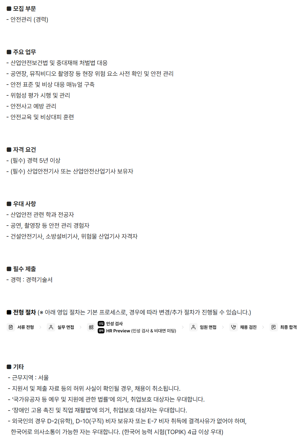 [JYP ENTERTAINMENT] ¾ÈÀü°ü¸® (°æ·Â) ¡á ¸ðÁý ​ºÎ¹® - ¾ÈÀü°ü¸® ​(°æ·Â) ¡á ​ÁÖ¿ä ¾÷¹« - »ê¾÷¾ÈÀüº¸°Ç¹ý ​¹× Áß´ëÀçÇØ ó¹ú¹ý ´ëÀÀ - °ø¿¬Àå, ​¹ÂÁ÷ºñµð¿À ​ÃÔ¿µÀå µî ​ÇöÀå À§Çè ¿ä¼Ò ​»çÀü È®ÀÎ ​¹× ​¾ÈÀü °ü¸® - ¾ÈÀü ​Ç¥ÁØ ​¹× ​ºñ»ó ´ëÀÀ ¸Å´º¾ó ​±¸Ãà - À§Ç輺 ​Æò°¡ ½ÃÇà ¹× ​°ü¸® - ¾ÈÀü»ç°í ​¿¹¹æ ​°ü¸® - ¾ÈÀü±³À° ¹× ºñ»ó´ëÇÇ ​ÈÆ·Ã ¡á ÀÚ°Ý ​¿ä°Ç - (Çʼö) ​°æ·Â 5³â ​ÀÌ»ó - (Çʼö) »ê¾÷¾ÈÀü±â»ç ​¶Ç´Â ​»ê¾÷¾ÈÀü»ê¾÷±â»ç º¸À¯ÀÚ ¡á ¿ì´ë ​»çÇ× - »ê¾÷¾ÈÀü °ü·Ã ​Çаú Àü°øÀÚ - °ø¿¬, ÃÔ¿µÀå µî ¾ÈÀü °ü¸® °æÇèÀÚ - °Ç¼³¾ÈÀü±â»ç, ¼Ò¹æ¼³ºñ±â»ç, À§Çè¹° »ê¾÷±â»ç ÀÚ°ÝÀÚ ¡á Çʼö Á¦Ãâ - °æ·Â : °æ·Â±â¼ú¼­