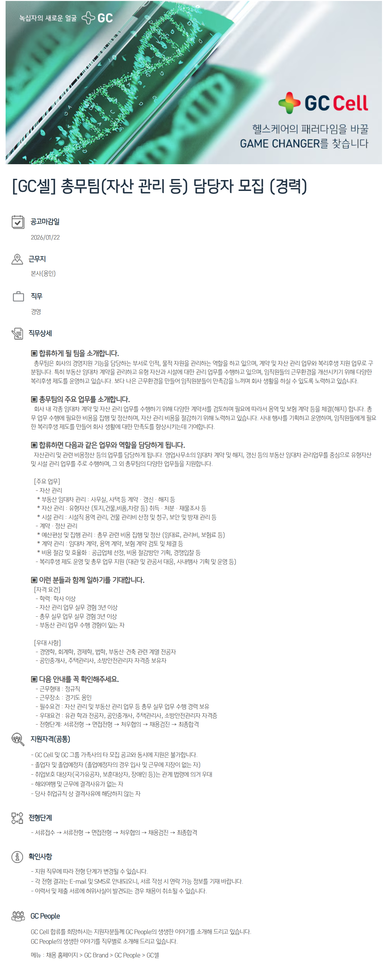 Á÷¹«»ó¼¼ ​ ¢Ã ÇÕ·ùÇÏ°Ô µÉ ÆÀÀ» ¼Ò°³ÇÕ´Ï´Ù. Ãѹ«ÆÀÀº ȸ»çÀÇ °æ¿µÁö¿ø ±â´ÉÀ» ´ã´çÇÏ´Â ºÎ¼­·Î ÀÎÀû, ¹°Àû ÀÚ¿øÀ» °ü¸®ÇÏ´Â ¿ªÇÒÀ» Çϰí ÀÖÀ¸¸ç, °è¾à ¹× ÀÚ»ê °ü¸® ¾÷¹«¿Í º¹¸®ÈÄ»ý Áö¿ø ¾÷¹«·Î ±¸ºÐµË´Ï´Ù. ƯÈ÷ ºÎµ¿»ê ÀÓ´ëÂ÷ °è¾àÀ» °ü¸®Çϰí À¯Çü ÀÚ»ê°ú ½Ã¼³¿¡ ´ëÇÑ °ü¸® ¾÷¹«¸¦ ¼öÇàÇϰí ÀÖÀ¸¸ç, ÀÓÁ÷¿øµéÀÇ ±Ù¹«È¯°æÀ» °³¼±½Ã۱â À§ÇØ ´Ù¾çÇÑ º¹¸®ÈÄ»ý Á¦µµ¸¦ ¿î¿µÇϰí ÀÖ½À´Ï´Ù. º¸´Ù ³ªÀº ±Ù¹«È¯°æÀ» ¸¸µé¾î ÀÓÁ÷¿øºÐµéÀÌ ¸¸Á·°¨À» ´À³¢¸ç ȸ»ç »ýȰÀ» ÇÏ½Ç ¼ö ÀÖµµ·Ï ³ë·ÂÇϰí ÀÖ½À´Ï´Ù. ¢Ã Ãѹ«ÆÀÀÇ ÁÖ¿ä ¾÷¹«¸¦ ¼Ò°³ÇÕ´Ï´Ù. ȸ»ç ³» °¢Á¾ ÀÓ´ëÂ÷ °è¾à ¹× ÀÚ»ê °ü¸® ¾÷¹«¸¦ ¼öÇàÇϱâ À§ÇØ ´Ù¾çÇÑ °è¾à¼­¸¦ °ËÅäÇϸç Çʿ信 µû¶ó¼­ ¿ë¿ª ¹× º¸Çè °è¾à µîÀ» ü°á(ÇØÁö) ÇÕ´Ï´Ù. Ãѹ« ¾÷¹« ¼öÇà¿¡ ÇÊ¿äÇÑ ºñ¿ëÀ» ÁýÇà ¹× Á¤»êÇϸç, ÀÚ»ê °ü¸® ºñ¿ëÀ» Àý°¨Çϱâ À§ÇØ ³ë·ÂÇϰí ÀÖ½À´Ï´Ù. »ç³» Çà»ç¸¦ ±âȹÇÏ°í ¿î¿µÇϸç, ÀÓÁ÷¿øµé¿¡°Ô ÇÊ¿äÇÑ º¹¸®ÈÄ»ý Á¦µµ¸¦ ¸¸µé¾î ȸ»ç »ýȰ¿¡ ´ëÇÑ ¸¸Á·µµ¸¦ Çâ»ó½Ã۴µ¥ ±â¿©ÇÕ´Ï´Ù. ¢Ã ÇÕ·ùÇÏ¸é ´ÙÀ½°ú °°Àº ¾÷¹«¿Í ¿ªÇÒÀ» ´ã´çÇÏ°Ô µË´Ï´Ù. ÀÚ»ê°ü¸® ¹× °ü·Ã ºñ¿ëÁ¤»ê µîÀÇ ¾÷¹«¸¦ ´ã´çÇÏ°Ô µË´Ï´Ù. ¿µ¾÷»ç¹«¼ÒÀÇ ÀÓ´ëÂ÷ °è¾à ¹× ÇØÁö, °»½Å µîÀÇ ºÎµ¿»ê ÀÓ´ëÂ÷ °ü¸®¾÷¹«¸¦ Áß½ÉÀ¸·Î À¯ÇüÀÚ»ê ¹× ½Ã¼³ °ü¸® ¾÷¹«¸¦ ÁÖ·Î ¼öÇàÇϸç, ±× ¿Ü Ãѹ«ÆÀÀÇ ´Ù¾çÇÑ ¾÷¹«µéÀ» Áö¿øÇÕ´Ï´Ù. [ÁÖ¿ä ¾÷¹«] - ÀÚ»ê °ü¸® * ºÎµ¿»ê ÀÓ´ëÂ÷ °ü¸® : »ç¹«½Ç, »çÅà µî °è¾à ¡¤ °»½Å ¡¤ ÇØÁö µî * ÀÚ»ê °ü¸® : À¯ÇüÀÚ»ê (ÅäÁö,°Ç¹°,ºñǰ,Â÷·® µî) Ãëµæ ¡¤ óºÐ ¡¤ Àç¹°Á¶»ç µî * ½Ã¼³ °ü¸® : ½Ã¼³Á÷ ¿ë¿ª °ü¸®, °Ç¹° °ü¸®ºñ »êÁ¤ ¹× û±¸, º¸¾È ¹× ¹æÀç °ü¸® µî - °è¾à ¡¤ Á¤»ê °ü¸® * ¿¹»êÆí¼º ¹× ÁýÇà °ü¸® : Ãѹ« °ü·Ã ºñ¿ë ÁýÇà ¹× Á¤»ê (ÀÓ´ë·á, °ü¸®ºñ, º¸Çè·á µî) * °è¾à °ü¸® : ÀÓ´ëÂ÷ °è¾à, ¿ë¿ª °è¾à, º¸Çè °è¾à °ËÅä ¹× Ã¼°á µî * ºñ¿ë Àý°¨ ¹× È¿À²È­ : °ø±Þ¾÷ü ¼±Á¤, ºñ¿ë Àý°¨¹æ¾È ±âȹ, °æÀïÀÔÂû µî - º¹¸®ÈÄ»ý Á¦µµ ¿î¿µ ¹× Ãѹ« ¾÷¹« Áö¿ø (´ë°ü ¹× °ü°ø¼­ ´ëÀÀ, »ç³»Çà»ç ±âȹ ¹× ¿î¿µ µî) ¢Ã ÀÌ·± ºÐµé°ú ÇÔ²² ÀÏÇϱ⸦ ±â´ëÇÕ´Ï´Ù. [ÀÚ°Ý ¿ä°Ç] - ÇзÂ: Çлç ÀÌ»ó - ÀÚ»ê °ü¸® ¾÷¹« ½Ç¹« °æÇè 3³â ÀÌ»ó - Ãѹ« ½Ç¹« ¾÷¹« ½Ç¹« °æÇè 3³â ÀÌ»ó - ºÎµ¿»ê °ü¸® ¾÷¹« ¼öÇà °æÇèÀÌ ÀÖ´Â ÀÚ [¿ì´ë »çÇ×] - °æ¿µÇÐ, ȸ°èÇÐ, °æÁ¦ÇÐ, ¹ýÇÐ, ºÎµ¿»ê¡¤°ÇÃà °ü·Ã °è¿­ Àü°øÀÚ - °øÀÎÁß°³»ç, ÁÖÅðü¸®»ç, ¼Ò¹æ¾ÈÀü°ü¸®ÀÚ ÀÚ°ÝÁõ º¸À¯ÀÚ ¢Ã ´ÙÀ½ ¾È³»¸¦ ²À È®ÀÎÇØÁÖ¼¼¿ä. - ±Ù¹«ÇüÅ : Á¤±ÔÁ÷ - ±Ù¹«Àå¼Ò : °æ±âµµ ¿ëÀÎ - Çʼö¿ä°Ç : ÀÚ»ê °ü¸® ¹× ºÎµ¿»ê °ü¸® ¾÷¹« µî Ãѹ« ½Ç¹« ¾÷¹« ¼öÇà °æ·Â º¸À¯ - ¿ì´ë¿ä°Ç : À¯°ü Çаú Àü°øÀÚ, °øÀÎÁß°³»ç, ÁÖÅðü¸®»ç, ¼Ò¹æ¾ÈÀü°ü¸®ÀÚ ÀÚ°ÝÁõ - ÀüÇü´Ü°è: ¼­·ùÀüÇü ¡æ ¸éÁ¢ÀüÇü ¡æ ó¿ìÇùÀÇ ¡æ ä¿ë°ËÁø ¡æ ÃÖÁ¾ÇÕ°Ý