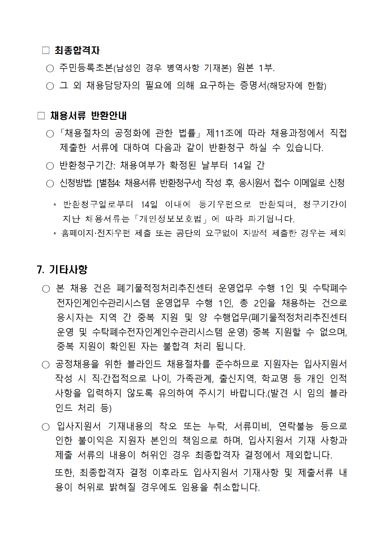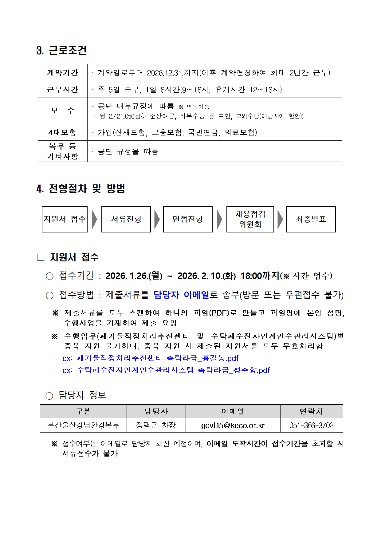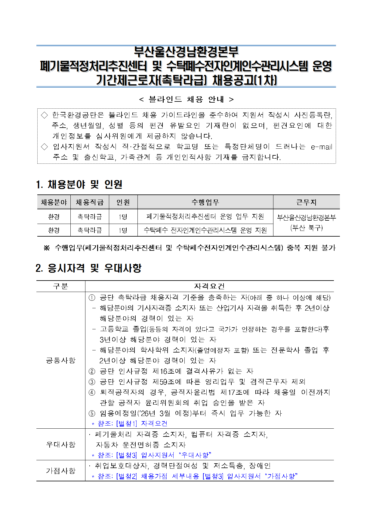 Çѱ¹È¯°æ°ø´Ü ºÎ»ê¿ï»ê°æ³²È¯°æº»ºÎ Æó±â¹°ÀûÁ¤Ã³¸®ÃßÁø¼¾ÅÍ ¹× ¼öŹÆó¼ö ÀüÀÚÀΰèÀμö°ü¸®½Ã½ºÅÛ ¿î¿µ ±â°£Á¦±Ù·ÎÀÚ(ÃËŹ¶ó±Þ) °¢ 1ÀΠä¿ë°ø°í(1Â÷)