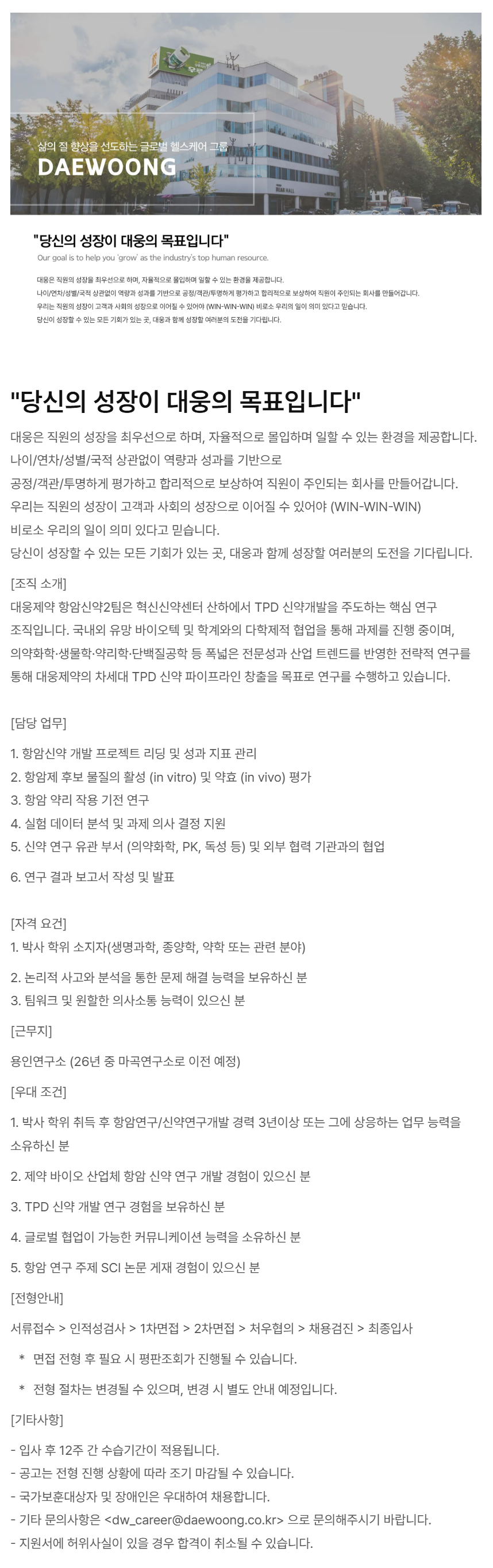 - ±âŸ ¹®ÀÇ»çÇ×Àº <dw_career@daewoong.co.kr******@*******.***> À¸·Î ¹®ÀÇÇØÁֽñ⠹ٶø´Ï´Ù.