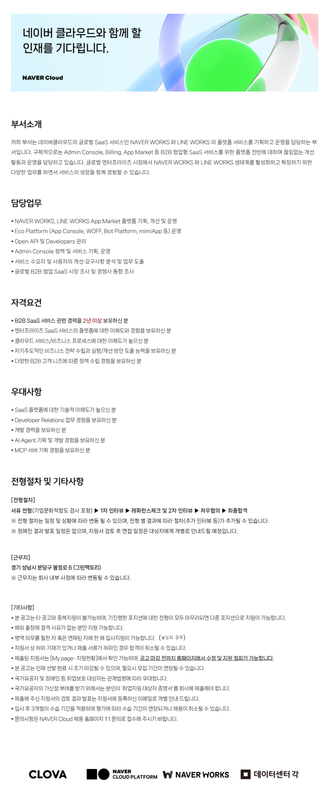 ÀúÈñ ºÎ¼´Â ³×À̹öŬ¶ó¿ìµåÀÇ ±Û·Î¹ú SaaS ¼ºñ½ºÀÎ NAVER WORKS ¿Í LINE WORKS ÀÇ Ç÷§Æû ¼ºñ½º¸¦ ±âȹÇÏ°í ¿î¿µÀ» ´ã´çÇÏ´Â ºÎ¼ÀÔ´Ï´Ù. ±¸Ã¼ÀûÀ¸·Î´Â Admin Console, Billing, App Market µî B2B Çù¾÷Çü SaaS ¼ºñ½º¸¦ À§ÇÑ Ç÷§Æû Àü¹Ý¿¡ ´ëÇÏ¿© ²÷ÀÓ¾ø´Â °³¼± Ȱµ¿°ú ¿î¿µÀ» ´ã´çÇϰí ÀÖ½À´Ï´Ù. ±Û·Î¹ú ¿£ÅÍÇÁ¶óÀÌÁî ½ÃÀå¿¡¼ NAVER WORKS ¿Í LINE WORKS »ýŰ踦 Ȱ¼ºÈÇϰí È®ÀåÇϱâ À§ÇÑ ´Ù¾çÇÑ ¾÷¹«¸¦ ÇÏ¸é¼ ¼ºñ½ºÀÇ ¼ºÀåÀ» ÇÔ²² °æÇèÇÒ ¼ö ÀÖ½À´Ï´Ù.