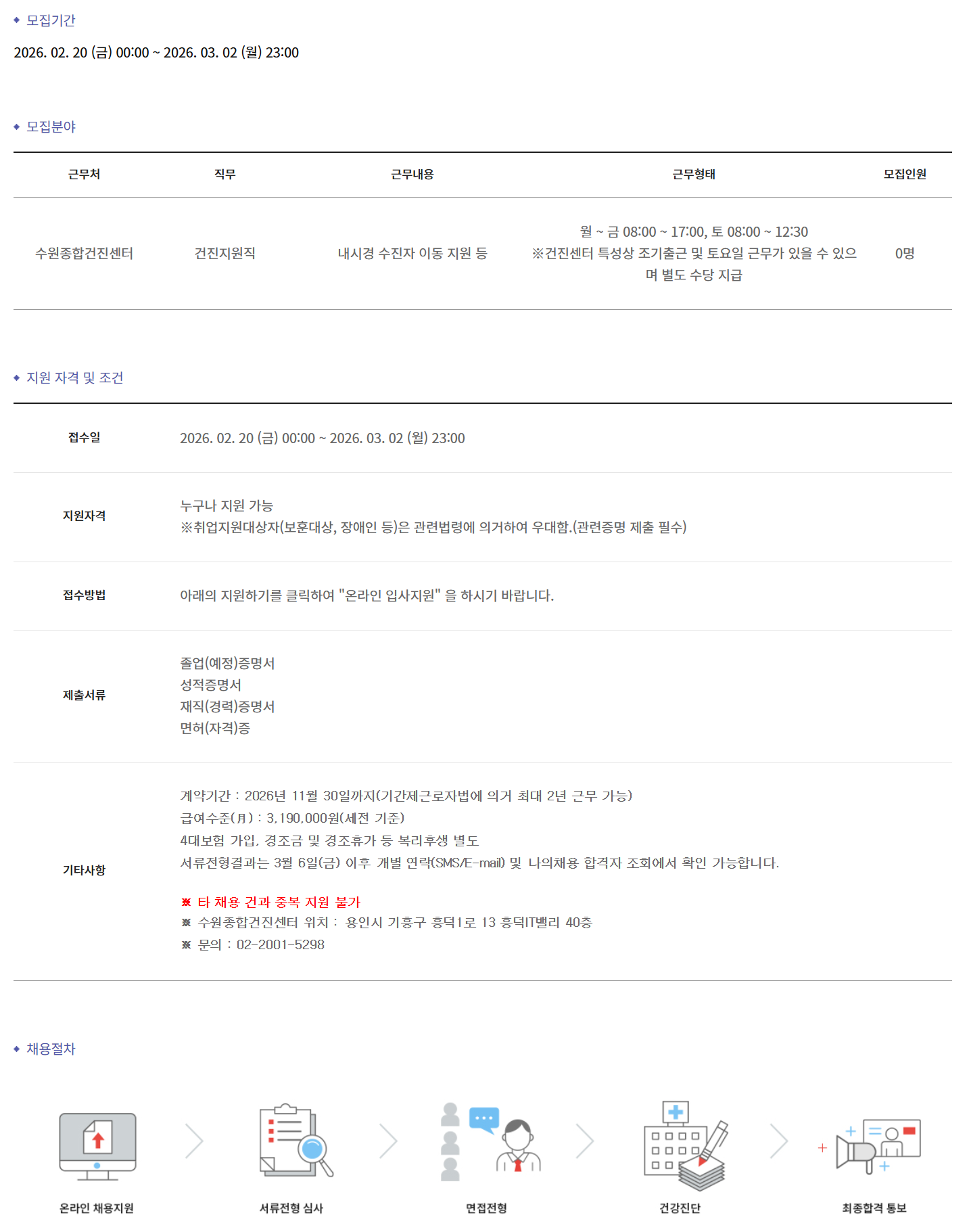 ±Ù¹«Ã³ Á÷¹« ±Ù¹«³»¿ë ±Ù¹«ÇüÅ ¸ðÁýÀοø ¼ö¿øÁ¾ÇÕ°ÇÁø¼¾ÅÍ °ÇÁøÁö¿øÁ÷ ³»½Ã°æ ¼öÁøÀÚ À̵¿ Áö¿ø µî ¿ù ~ ±Ý 08:00 ~ 17:00, Åä 08:00 ~ 12:30 ¡Ø°ÇÁø¼¾ÅÍ Æ¯¼º»ó Á¶±âÃâ±Ù ¹× Åä¿äÀÏ ±Ù¹«°¡ ÀÖÀ» ¼ö ÀÖÀ¸¸ç º°µµ ¼ö´ç Áö±Þ 0¸í