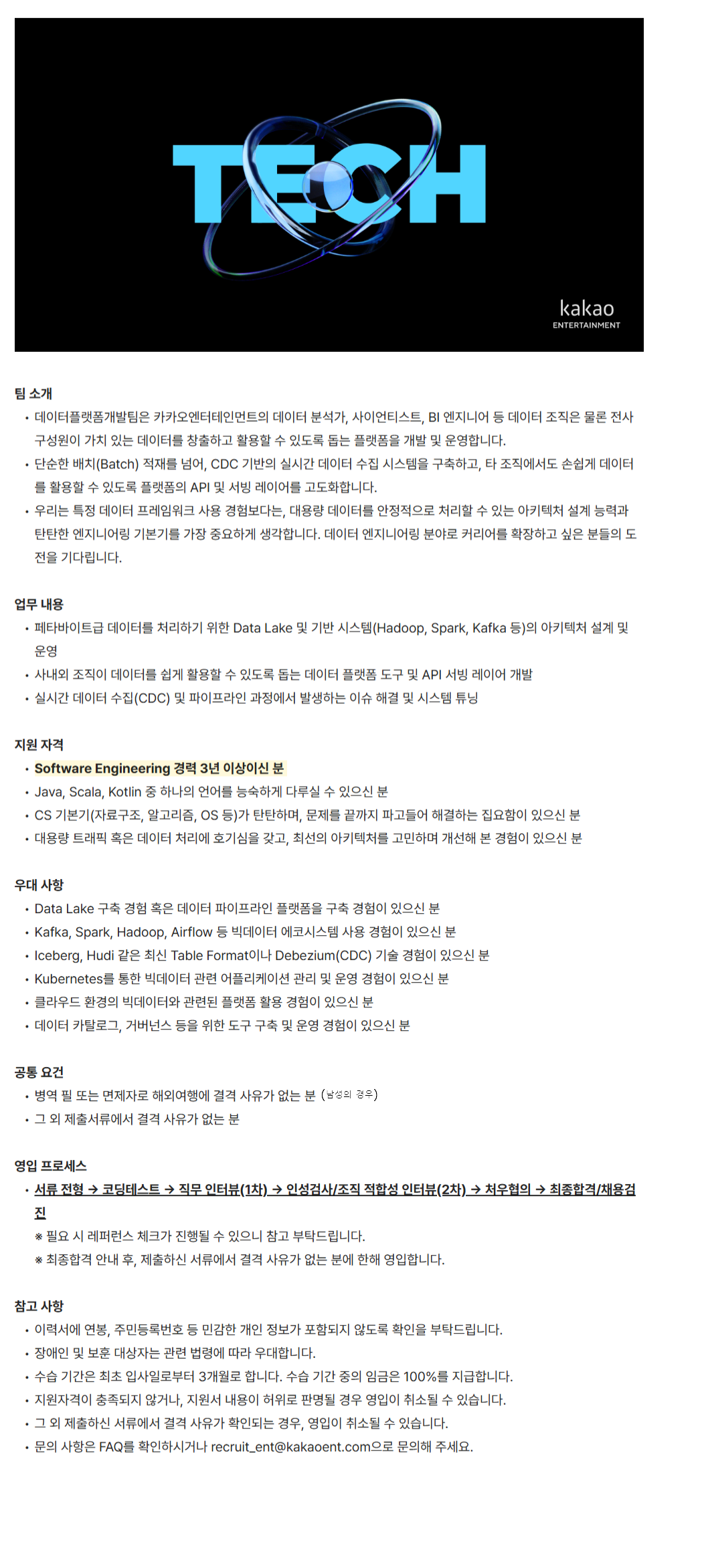 ÆÀ ¼Ò°³ ​ µ¥ÀÌÅÍÇ÷§Æû°³¹ßÆÀÀº ​īī¿À¿£ÅÍÅ×ÀÎ¸ÕÆ®ÀÇ ​µ¥ÀÌÅÍ ºÐ¼®°¡, ​»çÀÌ¾ðÆ¼½ºÆ®, BI ¿£Áö´Ï¾î µî ​µ¥ÀÌÅÍ ​Á¶Á÷Àº ¹°·Ð ​Àü»ç ±¸¼º¿øÀÌ °¡Ä¡ ​ÀÖ´Â µ¥ÀÌÅ͸¦ ​âÃâÇϰí ​Ȱ¿ëÇÒ ¼ö ​ÀÖµµ·Ï ​µ½´Â ​Ç÷§ÆûÀ» °³¹ß ¹× ​¿î¿µÇÕ´Ï´Ù. ´Ü¼øÇÑ ​¹èÄ¡(Batch) ÀûÀ縦 ³Ñ¾î, ​CDC ​±â¹ÝÀÇ ​½Ç½Ã°£ µ¥ÀÌÅÍ ¼öÁý ​½Ã½ºÅÛÀ» ±¸ÃàÇϰí, ​Ÿ ​Á¶Á÷¿¡¼­µµ ¼Õ½±°Ô ​µ¥ÀÌÅ͸¦ Ȱ¿ëÇÒ ​¼ö ​ÀÖµµ·Ï Ç÷§ÆûÀÇ API ​¹× ¼­ºù ​·¹À̾ °íµµÈ­ÇÕ´Ï´Ù. ¿ì¸®´Â ƯÁ¤ µ¥ÀÌÅÍ ÇÁ·¹ÀÓ¿öÅ© »ç¿ë °æÇ躸´Ù´Â, ´ë¿ë·® µ¥ÀÌÅ͸¦ ¾ÈÁ¤ÀûÀ¸·Î ó¸®ÇÒ ¼ö ÀÖ´Â ¾ÆÅ°ÅØÃ³ ¼³°è ´É·Â°ú źźÇÑ ¿£Áö´Ï¾î¸µ ±âº»±â¸¦ °¡Àå Áß¿äÇÏ°Ô »ý°¢ÇÕ´Ï´Ù. µ¥ÀÌÅÍ ¿£Áö´Ï¾î¸µ ºÐ¾ß·Î Ä¿¸®¾î¸¦ È®ÀåÇÏ°í ½ÍÀº ºÐµéÀÇ µµÀüÀ» ±â´Ù¸³´Ï´Ù. ¾÷¹« ³»¿ë ÆäŸ¹ÙÀÌÆ®±Þ µ¥ÀÌÅ͸¦ ó¸®Çϱâ À§ÇÑ Data Lake ¹× ±â¹Ý ½Ã½ºÅÛ(Hadoop, Spark, Kafka µî)ÀÇ ¾ÆÅ°ÅØÃ³ ¼³°è ¹× ¿î¿µ »ç³»¿Ü Á¶Á÷ÀÌ µ¥ÀÌÅ͸¦ ½±°Ô Ȱ¿ëÇÒ ¼ö ÀÖµµ·Ï µ½´Â µ¥ÀÌÅÍ Ç÷§Æû µµ±¸ ¹× API ¼­ºù ·¹ÀÌ¾î °³¹ß ½Ç½Ã°£ µ¥ÀÌÅÍ ¼öÁý(CDC) ¹× ÆÄÀÌÇÁ¶óÀÎ °úÁ¤¿¡¼­ ¹ß»ýÇÏ´Â À̽´ ÇØ°á ¹× ½Ã½ºÅÛ Æ©´× Áö¿ø ÀÚ°Ý Software Engineering °æ·Â 3³â ÀÌ»óÀ̽ŠºÐ Java, Scala, Kotlin Áß ÇϳªÀÇ ¾ð¾î¸¦ ´É¼÷ÇÏ°Ô ´Ù·ç½Ç ¼ö ÀÖÀ¸½Å ºÐ CS ±âº»±â(ÀڷᱸÁ¶, ¾Ë°í¸®Áò, OS µî)°¡ źźÇϸç, ¹®Á¦¸¦ ³¡±îÁö ÆÄ°íµé¾î ÇØ°áÇÏ´Â Áý¿äÇÔÀÌ ÀÖÀ¸½Å ºÐ ´ë¿ë·® Æ®·¡ÇÈ È¤Àº µ¥ÀÌÅÍ Ã³¸®¿¡ È£±â½ÉÀ» °®°í, ÃÖ¼±ÀÇ ¾ÆÅ°ÅØÃ³¸¦ °í¹ÎÇÏ¸ç °³¼±ÇØ º» °æÇèÀÌ ÀÖÀ¸½Å ºÐ