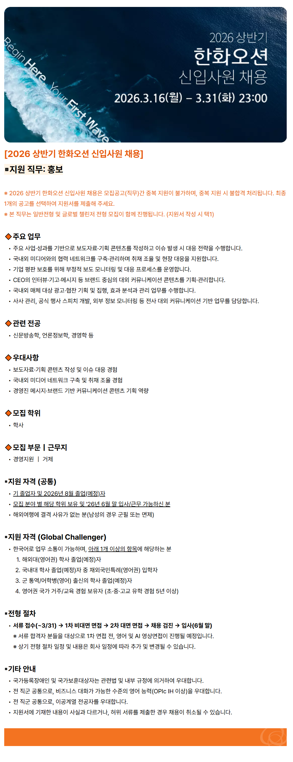 ¡Ø 2026 »ó¹Ý±â ÇÑÈ¿À¼Ç ½ÅÀÔ»ç¿ø ä¿ëÀº ¸ðÁý°ø°í(Á÷¹«)°£ Áߺ¹ Áö¿øÀÌ ºÒ°¡Çϸç, Áߺ¹ Áö¿ø ½Ã ºÒÇÕ°Ý Ã³¸®µË´Ï´Ù. ÃÖÁ¾ 1°³ÀÇ °ø°í¸¦ ¼±ÅÃÇÏ¿© Áö¿ø¼¸¦ Á¦ÃâÇØ ÁÖ¼¼¿ä.