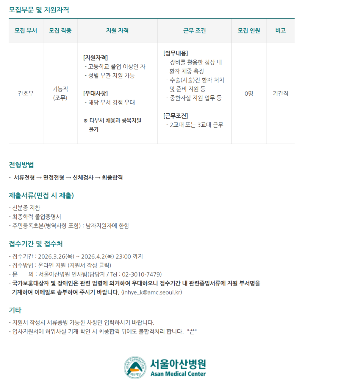 ¸ðÁý ºÎ¼­ ¸ðÁý Á÷Á¾ Áö¿ø ÀÚ°Ý ±Ù¹« Á¶°Ç ¸ðÁý Àοø ºñ°í °£È£ºÎ ±â´ÉÁ÷ (Á¶¹«) [Áö¿øÀÚ°Ý] - °íµîÇб³ Á¹¾÷ ÀÌ»óÀÎ ÀÚ - ¼ºº° ¹«°ü Áö¿ø °¡´É [¿ì´ë»çÇ×] - ÇØ´ç ºÎ¼­ °æÇè ¿ì´ë ¡Ø ŸºÎ¼­ ä¿ë°ú Áߺ¹Áö¿ø ºÒ°¡ [¾÷¹«³»¿ë] - Àåºñ¸¦ Ȱ¿ëÇÑ Ä§»ó ³» ȯÀÚ Ã¼Áß ÃøÁ¤ - ¼ö¼ú(½Ã¼ú)Àü ȯÀÚ Ã³Ä¡ ¹× Áغñ Áö¿ø µî - ÁßȯÀÚ½Ç Áö¿ø ¾÷¹« µî [±Ù¹«Á¶°Ç] - 2±³´ë ¶Ç´Â 3±³´ë ±Ù¹« 0¸í ±â°£Á÷