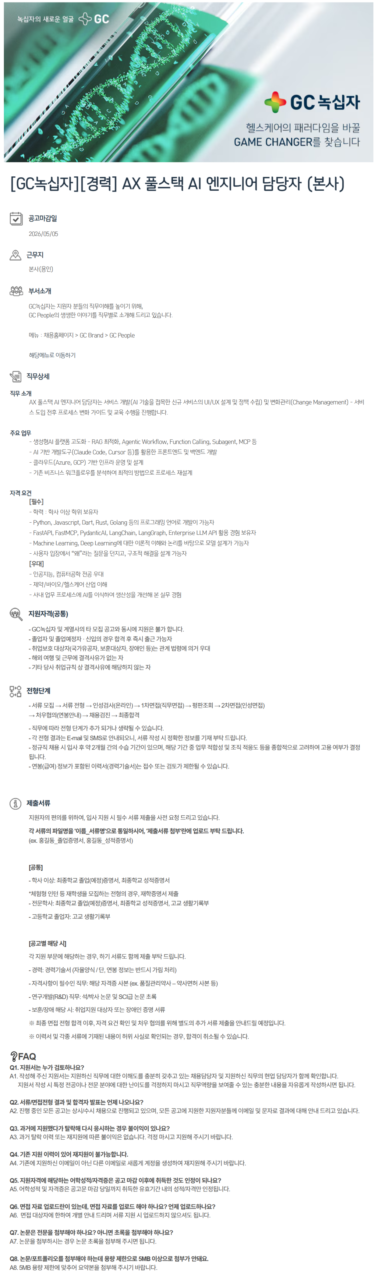 Á÷¹« ¼Ò°³ AX Ç®½ºÅà AI ¿£Áö´Ï¾î ´ã´çÀÚ´Â ¼­ºñ½º °³¹ß(AI ±â¼úÀ» Á¢¸ñÇÑ ½Å±Ô ¼­ºñ½ºÀÇ UI/UX ¼³°è ¹× Á¤Ã¥ ¼ö¸³) ¹× º¯È­°ü¸®(Change Management) - ¼­ºñ½º µµÀÔ ÀüÈÄ ÇÁ·Î¼¼½º º¯È­ °¡ÀÌµå ¹× ±³À° ¼öÇàÀ» ÁøÇàÇÕ´Ï´Ù. ÁÖ¿ä ¾÷¹« - »ý¼ºÇüAI Ç÷§Æû °íµµÈ­ - RAG ÃÖÀûÈ­, Agentic Workflow, Function Calling, Subagent, MCP µî - AI ±â¹Ý °³¹ßµµ±¸(Claude Code, Cursor µî)¸¦ Ȱ¿ëÇÑ ÇÁ·ÐÆ®¿£µå ¹× ¹é¿£µå °³¹ß - Ŭ¶ó¿ìµå(Azure, GCP) ±â¹Ý ÀÎÇÁ¶ó ¿î¿µ ¹× ¼³°è - ±âÁ¸ ºñÁî´Ï½º ¿öÅ©Ç÷ο츦 ºÐ¼®ÇÏ¿© ÃÖÀûÀÇ ¹æ¹ýÀ¸·Î ÇÁ·Î¼¼½º Àç¼³°è ÀÚ°Ý ¿ä°Ç [Çʼö] - Çз : Çлç ÀÌ»ó ÇÐÀ§ º¸À¯ÀÚ - Python, Javascript, Dart, Rust, Golang µîÀÇ ÇÁ·Î±×·¡¹Ö ¾ð¾î·Î °³¹ßÀÌ °¡´ÉÀÚ - FastAPI, FastMCP, PydanticAI, LangChain, LangGraph, Enterprise LLM API Ȱ¿ë °æÇè º¸À¯ÀÚ - Machine Learning, Deep Learning¿¡ ´ëÇÑ ÀÌ·ÐÀû ÀÌÇØ¿Í ³í¸®¸¦ ¹ÙÅÁÀ¸·Î ¸ðµ¨ ¼³°è°¡ °¡´ÉÀÚ - »ç¿ëÀÚ ÀÔÀå¿¡¼­ ¡°¿Ö¡±¶ó´Â Áú¹®À» ´øÁö°í, ±¸Á¶Àû ÇØ°áÀ» ¼³°è °¡´ÉÀÚ [¿ì´ë] - ÀΰøÁö´É, ÄÄÇ»ÅͰøÇÐ Àü°ø ¿ì´ë - Á¦¾à/¹ÙÀÌ¿À/ÇコÄÉ¾î »ê¾÷ ÀÌÇØ - »ç³» ¾÷¹« ÇÁ·Î¼¼½º¿¡ AI¸¦ À̽ÄÇÏ¿© »ý»ê¼ºÀ» °³¼±ÇØ º» ½Ç¹« °æÇè Áö¿øÀÚ°Ý Áö¿øÀÚ°Ý(°øÅë)​ - GC³ì½ÊÀÚ ¹× °è¿­»çÀÇ Å¸ ¸ðÁý °ø°í¿Í µ¿½Ã¿¡ Áö¿øÀº ºÒ°¡ ÇÕ´Ï´Ù. - Á¹¾÷ÀÚ ¹× Á¹¾÷¿¹Á¤ÀÚ​ ¡¤ ½ÅÀÔÀÇ °æ¿ì ÇÕ°Ý ÈÄ Áï½Ã Ãâ±Ù °¡´ÉÀÚ - Ãë¾÷º¸È£ ´ë»óÀÚ(±¹°¡À¯°øÀÚ, º¸ÈÆ´ë»óÀÚ, Àå¾ÖÀÎ µî)´Â °ü°è ¹ý·É¿¡ ÀǰŠ¿ì´ë - ÇØ¿Ü ¿©Çà ¹× ±Ù¹«¿¡ °á°Ý»çÀ¯°¡ ¾ø´Â ÀÚ​ - ±âŸ ´ç»ç Ãë¾÷±ÔÄ¢ »ó °á°Ý»çÀ¯¿¡ ÇØ´çÇÏÁö ¾Ê´Â ÀÚ