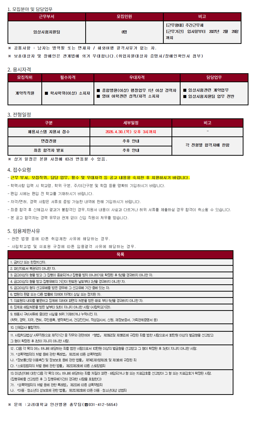 [¾È»êº´¿ø26-33] ÀÓ»ó½ÃÇèÁö¿øÆÀ °è¾àÁ÷Á÷¿ø ¸ðÁý 1. ¸ðÁýºÐ¾ß ¹× ´ã´ç¾÷¹« ±Ù¹«ºÎ¼­ ¸ðÁýÀοø ºñ°í ÀÓ»ó½ÃÇèÁö¿øÆÀ 0¸í [±Ù¹«ÇüÅÂ] ÁÖ°£±Ù¹«Á¦ [±Ù¹«±â°£] ÀÔ»çÀϺÎÅÍ 2027³â 2¿ù 28ÀÏ ±îÁö ¡Ø °øÅë»çÇ× : ³²ÀÚ´Â º´¿ªÇÊ ¶Ç´Â ¸éÁ¦ÀÚ / ÇØ¿Ü¿©Çà °á°Ý»çÀ¯°¡ ¾ø´Â ÀÚ. ¡Ø º¸ÈÆ´ë»óÀÚ ¹× Àå¾ÖÀÎÀº °ü°è¹ý¿¡ ÀǰŠ¿ì´ëÇÕ´Ï´Ù.(Ãë¾÷Áö¿ø´ë»óÀÚ Áõ¸í¼­/Àå¾ÖÀÎÈ®Àμ­ ÷ºÎ) 2. ÀÀ½ÃÀÚ°Ý ¸ðÁýÁ÷À§ ÇʼöÀÚ°Ý ¿ì´ëÀÚ°Ý ´ã´ç¾÷¹« °è¾àÁ÷Á÷¿ø ¡á ÇлçÇÐÀ§(ÀÌ»ó) ¼ÒÁöÀÚ ¡á Á¾ÇÕº´¿ø(ÀÌ»ó) ÇàÁ¤¾÷¹« 1³â ÀÌ»ó °æ·ÂÀÚ ¡á ¿µ¾î ¾îÇаü·Ã ¼ºÀû/ÀÚ°Ý ¼ÒÁöÀÚ ¡á ÀÓ»ó½ÃÇè°ü·Ã °è¾à¾÷¹« ¡á ÀÓ»ó½ÃÇèÁö¿øÆÀ ¾÷¹« Àü¹Ý 3. ÀüÇüÀÏÁ¤ ±¸ºÐ ¼¼ºÎÀÏÁ¤ ºñ°í ä¿ë½Ã½ºÅÛ Áö¿ø¼­ Á¢¼ö 2026.4.30.(¸ñ) ¿ÀÈÄ 3½Ã±îÁö - ¸éÁ¢ÀüÇü ÃßÈÄ ¾È³» °¢ ÀüÇüº° ÇÕ°ÝÀÚ¿¡ ÇÑÇÔ ÃÖÁ¾ ÇÕ°ÝÀÚ ¹ßÇ¥ ÃßÈÄ ¾È³» ¡Ø »ó±â ÀÏÁ¤Àº º»¿ø »çÁ¤¿¡ µû¶ó º¯µ¿µÉ ¼ö ÀÖÀ½. 4. Á¢¼ö¿ä·É - ±Ù¹« ºÎ¼­, ¸ðÁýÁ÷À§, ´ã´ç ¾÷¹«, Çʼö ¹× ¿ì´ëÀÚ°Ý µî °ø°í ³»¿ëÀ» ¼÷ÁöÇÑ ÈÄ Áö¿øÇϽñ⠹ٶø´Ï´Ù. - Çз»çÇ× ÀÔ·Â ½Ã Çб³¸í, ÇÐÀ§ ±¸ºÐ, ÁÖ/¾ß°£±¸ºÐ ¹× ÇÐÁ¡ µîÀ» ¸íÈ®È÷ ±âÀÔÇϽñ⠹ٶø´Ï´Ù. - ÆíÀÔ ½Ã¿¡´Â ÆíÀÔ Àü Çб³¸¦ ±âÀçÇϽñ⠹ٶø´Ï´Ù. - ÀÚ°Ý/¸éÇã, °æ·Â »çÇ×Àº ¼­·ù·Î Áõºù °¡´ÉÇÑ ³»¿ª¿¡ ÇÑÇØ ±âÀÔÇϽñ⠹ٶø´Ï´Ù. - ÃÖÁ¾ ÇÕ°Ý ÈÄ ½Åü°Ë»ç °á°ú°¡ ºÒÇÕ°ÝÀÎ °æ¿ì,Áö¿ø¼­ ³»¿ëÀÌ »ç½Ç°ú ´Ù¸£°Å³ª ÇãÀ§ ¼­·ù¸¦ Á¦ÃâÇÏ½Ç °æ¿ì ÇÕ°ÝÀÌ Ãë¼ÒµÉ ¼ö ÀÖ½À´Ï´Ù. - º» °ø°í ÇÕ°ÝÀÚ´Â °æ·Â À¯¹«¿Í °ü°è ¾øÀÌ ½ÅÀÔ Á÷¿øÀÇ Ã³¿ì¸¦ ¹Þ½À´Ï´Ù. 5. ÀÓ¿ëÁ¦ÇÑ»çÀ¯ - °ü·Ã ¹ý·É µî¿¡ µû¸¥ Ãë¾÷Á¦ÇÑ »çÀ¯¿¡ ÇØ´çÇÏ´Â °æ¿ì. - »ç¸³Çб³¹ý ¹× ÀÇ·á¿ø ±ÔÁ¤¿¡ µû¸¥ ÀÓ¿ë°á°Ý »çÀ¯¿¡ ÇØ´çÇÏ´Â °æ¿ì. ¸ñ·Ï 1. ±ÝÄ¡»ê ¶Ç´Â ÇÑÁ¤Ä¡»êÀÚ. 2. ÆÄ»êÀڷμ­ º¹±ÇµÇÁö ¾Æ´ÏÇÑ ÀÚ. 3. ±Ý°íÀÌ»óÀÇ ÇüÀ» ¹Þ°í ±× ÁýÇàÀÌ Á¾·áµÇ°Å³ª ÁýÇàÀ» ¹ÞÁö ¾Æ´ÏÇϱâ·Î È®Á¤µÈ ÈÄ 5³âÀ» °æ°úÇÏÁö ¾Æ´ÏÇÑ ÀÚ. 4. ±Ý°íÀÌ»óÀÇ ÇüÀ» ¹Þ°í ÁýÇàÀ¯¿¹ÀÇ ±â°£ÀÌ ¿Ï·áµÈ ³¯·ÎºÎÅÍ 2³âÀ» °æ°úÇÏÁö ¾Æ´ÏÇÑ ÀÚ. 5. ±Ý°íÀÌ»óÀÇ ÇüÀÇ ¼±°íÀ¯¿¹¸¦ ¹ÞÀº °æ¿ì¿¡ ±× ¼±°íÀ¯¿¹ ±â°£ Áß¿¡ ÀÖ´Â ÀÚ. 6. ¹ý¿øÀÇ ÆÇ°á ¶Ç´Â ´Ù¸¥ ¹ý·ü¿¡ ÀÇÇÏ¿© ÀÚ°ÝÀÌ »ó½Ç ¶Ç´Â Á¤ÁöµÈ ÀÚ. 7. ÀÇ·á¿øÀÇ ³»¿Ü¸¦ ºÒ¹®Çϰí ¡°è¿¡ ÀÇÇÏ¿© ÆÄ¸éÀÇ Ã³ºÐÀ» ¹ÞÀº ¶§·Î ºÎÅÍ 5³âÀ» °æ°úÇÏÁö ¾Æ´ÏÇÑ ÀÚ. 8. ¡°è·Î ÇØÀÓóºÐÀ» ¹ÞÀº ³¯ºÎÅÍ 3³âÀÌ Áö³ªÁö ¾Æ´ÏÇÑ »ç¶÷ (»ç¸³Çб³±â°ü). 9. ä¿ë½Ã ±¸ºñ¼­·ù¿¡ Áß´ëÇÑ »ç½ÇÀ» ÇãÀ§ ±âÀçÇϰųª ´©¶ô½ÃŲ ÀÚ. (ÇзÂ, °æ·Â, ÀÚ°Ý, ¸éÇã, Áֹεî·Ï, º´ÀûÈ®Àμ­, °Ç°­Áø´Ü¼­, Àû¼º°Ë»ç¼­, ½Å¿ø, ÀçÁ¤º¸Áõ¼­, °¡Á·°ü°èÁõ¸í¼­ µî) 10. ½Åü°Ë»ç ºÒÇÕ°ÝÀÚ. 11. »ç¸³Çб³¹ý»ó »ç¹«Á÷¿øÀ¸·Î ÀçÁ÷±â°£ Áß Á÷¹«¿Í °ü·ÃÇÏ¿© ¡¸Çü¹ý¡¹ Á¦355Á¶¹× Á¦356Á¶¿¡ ±ÔÁ¤µÈ Á˸¦ ¹üÇÑ »ç¶÷À¸·Î¼­ 300¸¸¿ø ÀÌ»óÀÇ ¹ú±ÝÇüÀ» ¼±°í¹Þ°í ±× ÇüÀÌ È®Á¤µÈ ÈÄ 2³âÀÌ Áö³ªÁö ¾Æ´ÏÇÑ »ç¶÷. 12 . ´ÙÀ½ °¢ ¸ñÀÇ ¾î´À Çϳª¿¡ ÇØ´çÇÏ´Â Á˸¦ ¹üÇÑ »ç¶÷À¸·Î¼­ 100¸¸¿ø ÀÌ»óÀÇ ¹ú±ÝÇüÀ» ¼±°í¹Þ°í ±× ÇüÀÌ È®Á¤µÈ ÈÄ 3³âÀÌ Áö³ªÁö ¾Æ´ÏÇÑ »ç¶÷. °¡.¡¸¼ºÆø·Â¹üÁËÀÇ Ã³¹ú µî¿¡ °üÇÑ Æ¯·Ê¹ý¡¹ Á¦2Á¶¿¡ µû¸¥ ¼ºÆø·Â¹üÁË ³ª.¡¸Á¤º¸Åë½Å¸Á ÀÌ¿ëÃËÁø ¹× Á¤º¸º¸È£ µî¿¡ °üÇÑ ¹ý·ü¡¹ Á¦74Á¶Á¦1Ç×Á¦2È£ ¹× Á¦3È£¿¡ ±ÔÁ¤µÈ ÁË ´Ù.¡¸½ºÅäÅ·¹üÁËÀÇ Ã³¹ú µî¿¡ °üÇÑ ¹ý·ü¡¹ Á¦2Á¶Á¦2È£¿¡ µû¸¥ ½ºÅäÅ·¹üÁË 13. ¹Ì¼º³âÀÚ¿¡ ´ëÇÑ ´ÙÀ½ °¢ ¸ñÀÇ ¾î´À Çϳª¿¡ ÇØ´çÇÏ´Â Á˸¦ ÀúÁú·¯ ÆÄ¸é¤ýÇØÀӵǰųª Çü ¶Ç´Â Ä¡·á°¨È£¸¦ ¼±°í¹Þ¾Æ ±× Çü ¶Ç´Â Ä¡·á°¨È£°¡ È®Á¤µÈ »ç¶÷. (ÁýÇàÀ¯¿¹¸¦ ¼±°í¹ÞÀº ÈÄ ±× ÁýÇàÀ¯¿¹±â°£ÀÌ °æ°úÇÑ »ç¶÷À» Æ÷ÇÔÇÑ´Ù) °¡. ¡¸¼ºÆø·Â¹üÁËÀÇ Ã³¹ú µî¿¡ °üÇÑ Æ¯·Ê¹ý¡¹ Á¦2Á¶¿¡ µû¸¥ ¼ºÆø·Â¹üÁË ³ª. ¡¸¾Æµ¿¤ýû¼Ò³âÀÇ ¼ºº¸È£¿¡ °üÇÑ ¹ý·ü¡¹ Á¦2Á¶Á¦2È£¿¡ µû¸¥ ¾Æµ¿¤ýû¼Ò³â´ë»ó ¼º¹üÁË ¡Ø ¹®ÀÇ :°í·Á´ëÇб³ ¾È»êº´¿ø Ãѹ«ÆÀ(¢Ï***-****-****)